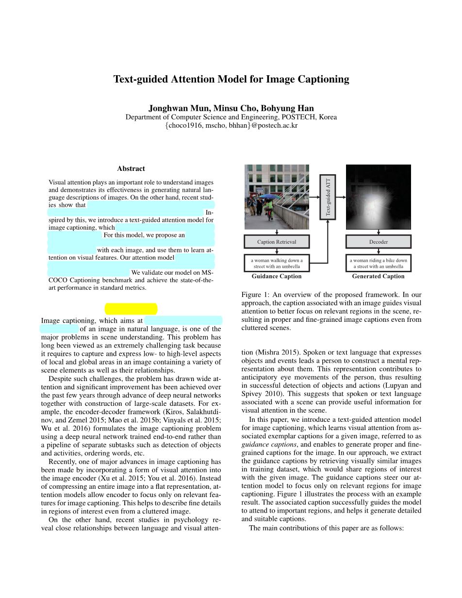 在本文中,我们引入了一个用于图像字幕的基于文本引导的注意模型,该模型从给定图像的相关示例字幕学习视觉注意,称为引导字幕,并且能够为图像生成适当且细粒度的字幕。在我们的方法中,我们通过在训练数据集中检索视觉上相似的图像来提取引导字幕,该图像将与给定图像共享感兴趣的区域。引导标题引导我们的注意力模型仅关注与图像字幕相关的区域。图1以一个示例的结果来说明了该过程。相关标题成功指导模型参与重要区域,并帮助其生成详细和合适的字幕。