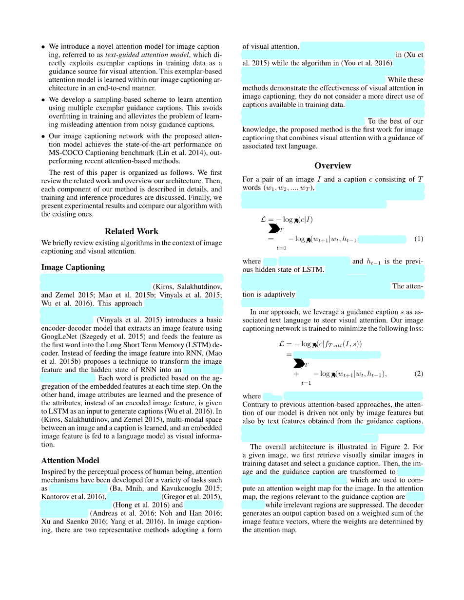 受人类感知过程的启发,当前已经针对各种任务场景开发出了多种注意机制,如物体识别(Ba,Mnih和Kavukcuoglu 2015; Kantorov等2016),图像生成(Gregor等人2015),语义 细分(Hong et al.2016)和视觉问答(Andreas等人2016; Noh和Han 2016; Xu和Saenko 2016; Yang等人2016)。在图像字幕自动生成中,有两种形式的采用视觉注意的代表性方法。在(You et al。2015)的每个时间步骤中使用LSTM的隐藏状态估计单词的空间注意力,而(You et al。2016)中的算法计算对字幕候选单词的语义关注,使用它来细化每一步的LSTM输入和输出。虽然这些方法证明了视觉注意在图像字幕中的有效性,但它们并未考虑更直接地使用训练数据中可用的字幕。我们的方法通过学习经历了推理的字幕,将它们作为视觉注意的高级指导。据我们所知,上面所提出的方法是图像字幕生成的第一项工作,它将视觉注意力与相关文本语言的指导相结合。