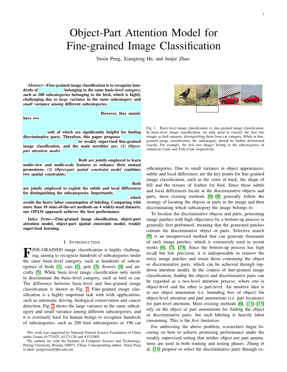 为了定位判别对象和部分,通常首先执行通过自下而上过程生成具有高无物体的图像补丁,这意味着生成的补丁包含一个或多个判别对象。选择性搜索是一种无监督的方法,可以生成数千个这样的图像块,在最近的工作中被广泛使用。由于自下而上的过程具有高回忆率但是精度低,因此必须去除噪声图像块并保留包含对象或辨别部分的图像,这可以通过自上而下的注意模型来实现。在细粒度图像分类的上下文中,找到对象和判别部分可以被视为两级关注过程,其中一个是对象级别而另一个是部分级别。直观的想法是使用对象注释(即,对象的边界框)用于对象级注意和部分注释(即,部分位置)以用于部分级注意。大多数现有的方法,关于找到反对者或歧视性部分的对象或部分注释,但这种标记是非常耗费人力的。这是第一个限制。