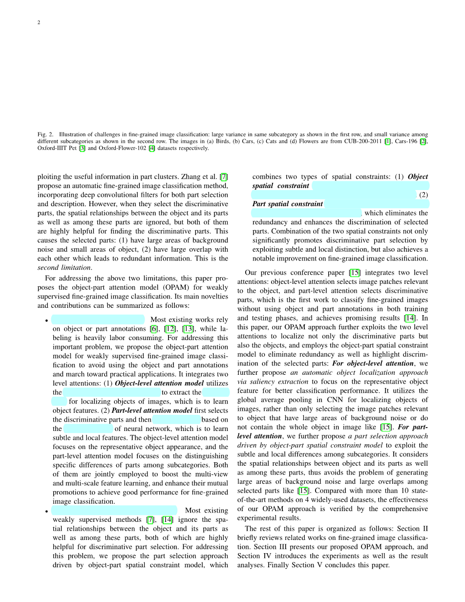 为了解决上述问题,研究人员开始关注如何在弱监督环境下实现有希望的性能,即在训练和测试阶段都不使用对象或部分注释。张等人。 [[4]建议通过利用部分集群中的有用信息来选择判别部分。张等人。 [7]提出了一种自动细粒度图像分类方法,结合深度卷积滤波器用于部件选择和描述。然而,当他们选择辨别部分时,对象及其部分之间以及这些部分之间的空间关系被忽略,但是它们都非常有助于找到辨别部分。这导致所选择的部分:(1)具有大面积的背景噪声和小的物体区域,(2)彼此具有大的重叠,这导致冗余信息。这是第二个限制。