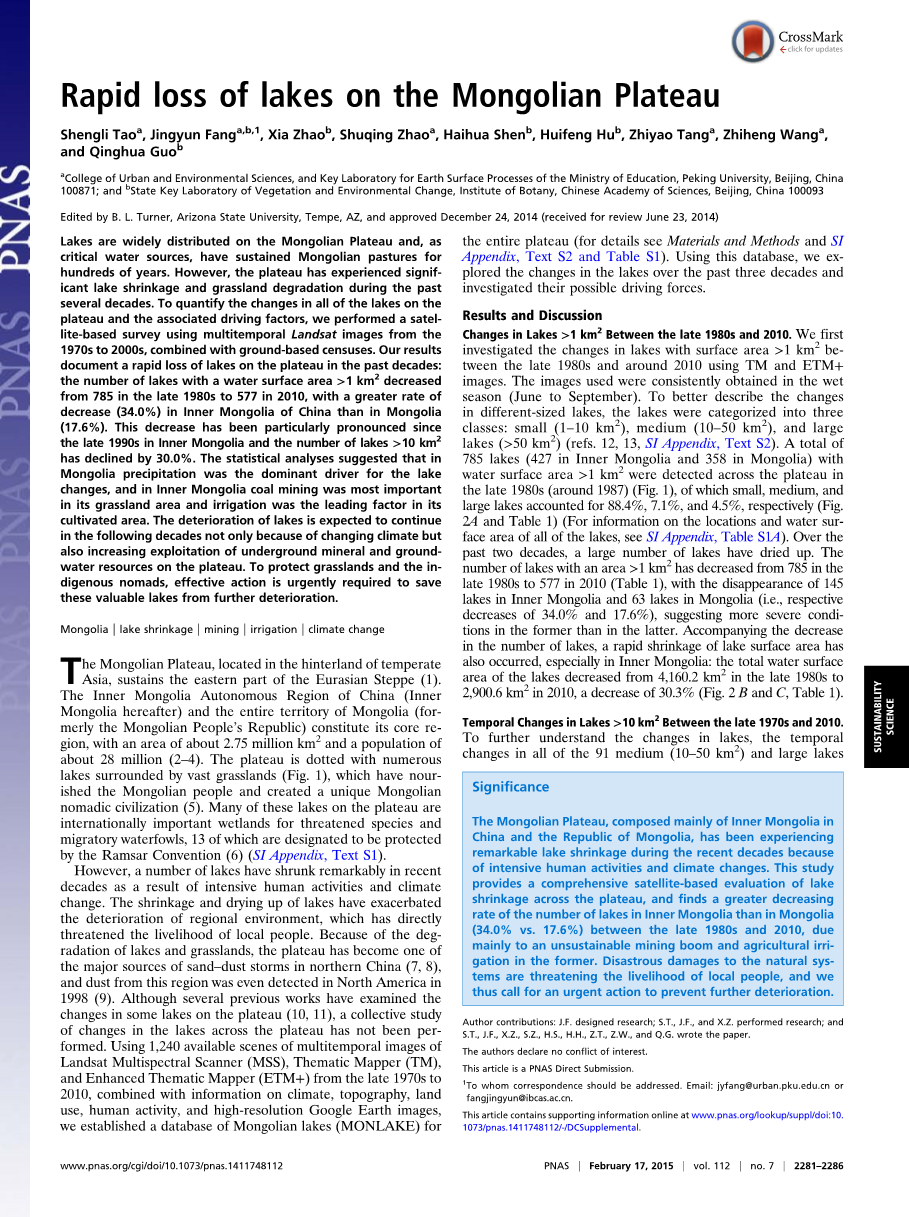 蒙古高原位于亚洲温带腹地,维系着欧亚草原的东部(1)。中国的内蒙古自治区(内蒙古下同)和蒙古全境(原蒙古人民共和国)构成了它的核心区域,面积约275万平方公里,人口约2800万(2 - 4)。高原湖泊星罗棋布,草原辽阔(图1),滋养了蒙古族人民,创造了独特的蒙古游牧文明(5)。青藏高原上的许多湖泊是国际上重要的湿地,是濒危物种和迁徙水鸟的栖息地,其中13个被指定受“拉姆萨尔公约”保护(6)(SI附录,文本S1)。然而,由于密集的人类活动和气候变化,近几十年来一些湖泊显著缩小。湖泊的萎缩和干涸加剧了区域环境的恶化,直接威胁着当地人民的生活。由于湖泊和草原的退化,青藏高原已成为中国北方沙尘暴的主要来源之一(7,8),1998年甚至在北美发现了来自该地区的尘土(9)。虽然之前的几项工作已经研究了青藏高原上一些湖泊的变化(10,11),但是还没有对整个青藏高原湖泊的变化进行整体研究。使用从20世纪70年代末到2010年的Landsat多光谱扫描仪(MSS),Thematic Mapper(TM)和增强型专题制图仪(ETM )的1,240个多时相图像场景,以及有关气候,地形,土地利用,人类活动和在高分辨率的Google Earth图像中,我们为整个高原建立了蒙古湖泊(MONLAKE)数据库(详见材料和方法以及SI附录,文本S2和表S1)。使用这个数据库,我们探索了过去三十年来湖泊的变化,并研究了它们可能的驱动力。