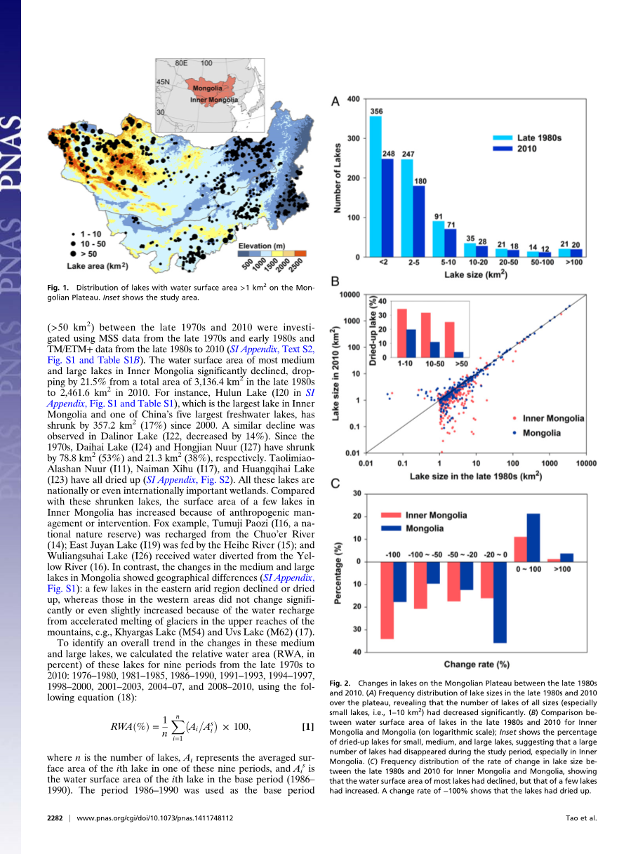 其中 n是湖泊数量, Ai代表这九个时期之一的第 i个湖泊的平均表面积, Ais是基准期内第 i个湖泊的水面面积(1986-1990)。使用1986 - 1990年期间被用作基准期,因为在此期间所有中型和大型湖泊都有卫星图像。