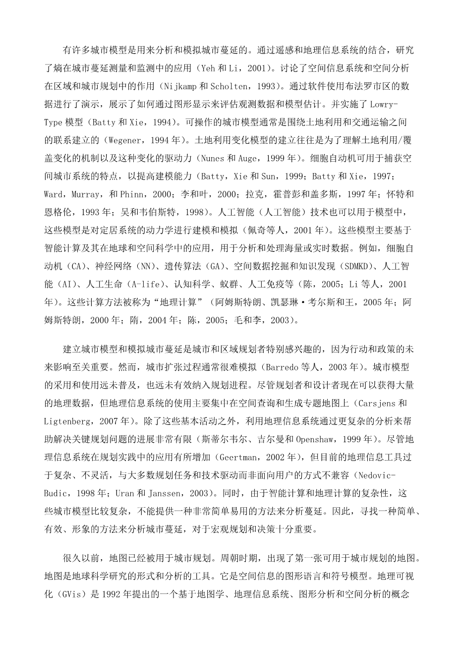 Traditionally, the research of urban sprawl mainly bases on qualitative analysis and perceptual knowledge and is short of quantitative analysis. With the development of urban science such as urban planning, urban geography, quantitative geography, geographical information system (GIS), cartography, intelligence computation and applications, the research of urban sprawl becomes more quantitative and more rational.