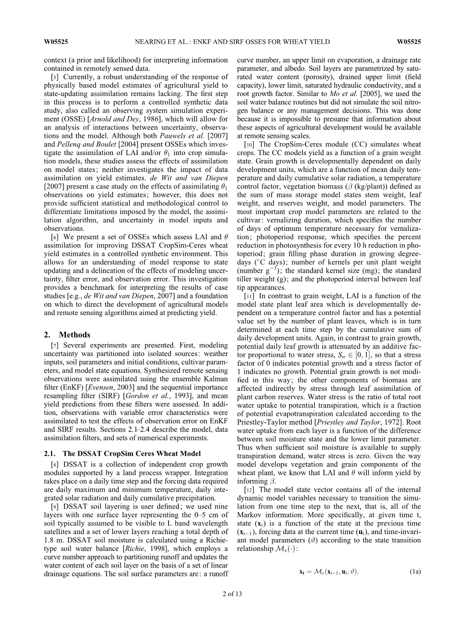 - 目前,仍然缺乏对基于物理的农业产量估算对国家更新同化的响应的充分理解。该过程的第一步是进行受控的合成数据研究,也称为观测系统模拟实验(OSSE)[Arnold和Dey,1986],它将允许分析不确定性,观测和模型之间的相互作用。虽然Pauwels等人都有。[2007]和Pellenq和Boulet [2004]提出的OSSE研究了LAI和/或theta;1 对作物模拟模型的同化,这些研究评估了同化对模型状态的影响;既没有研究数据同化对产量估算的影响。de Wit和van Diepen [2007]提出了关于同化和1 观察对产量估计的影响的案例研究;然而,这并没有提供足够的统计和方法控制来区分模型,同化算法和模型输入和观察中的不确定性所施加的限制。