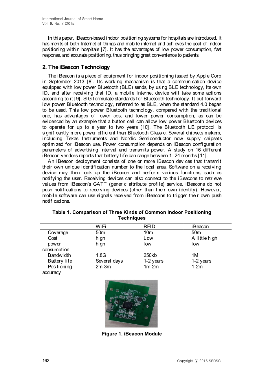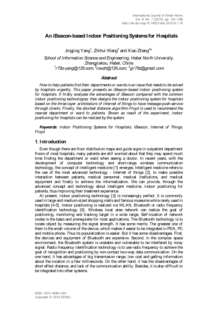 如何帮助患者去找到他们的科室或者病房是一个急需被医院解决的问题。这篇论文提出一个基于iBeacon的医院室内定位系统。该论文首先分析与常见室内定位技术相比iBeacon的优势;然后为医院设计一个基于物联网三层框架来实现通过计算机客户端实现信息推送服务的室内定位系统。最后,最短路径被推送给患者去寻找最近的科室或病区。就实验结果来看,该系统可以实现医院的室内定位。