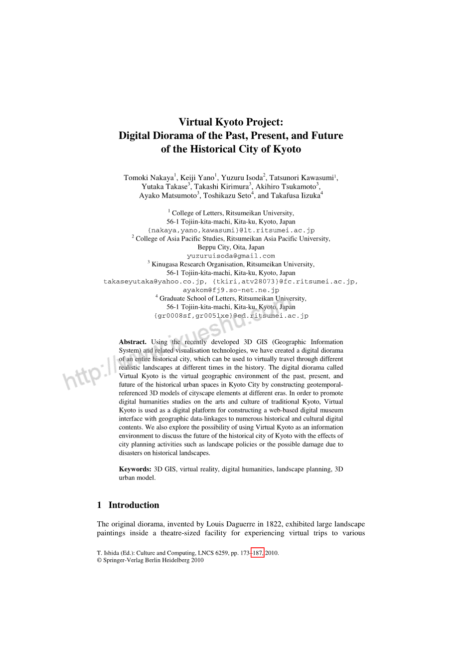 在这项研究中,我们的目标是探索使用一组数字立体模型的可能性日本历史名城京都,称为虚拟京都[3],作为数字平台加强京都艺术和文化的信息共享以及鼓励讨论这座历史文化名城的未来及其丰富的文化遗产。虚拟京都是作为过去和现在的历史城市的基于GIS的VGE创建的通过构建大量以地理时空参考的3D来构建城市空间不同年龄的城市景观元素模型。到目前为止,我们发表的研究[4-6]主要集中在历史景观的恢复和建模各种现代和历史地理信息来源。这样的努力恢复过去可以被视为通过这个伟大的回忆的虚拟旅程历史名城。我们在这里讨论数字立体模拟虚拟的想法和方法京都,检索和收集有关京都和京都的艺术和文化的信息将其应用于城市未来景观的规划考虑。