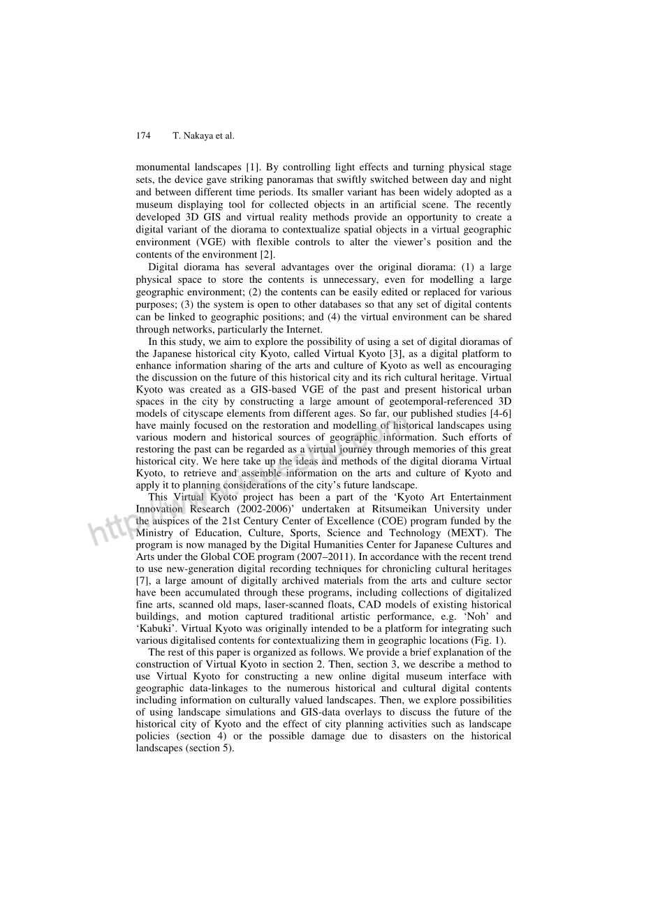 本文的其余部分安排如下。 我们提供简要说明在第2节中构建虚拟京都。然后,第3节,我们描述了一种方法使用Virtual Kyoto构建一个新的在线数字博物馆界面地理数据 - 与众多历史和文化数字内容的联系包括有关文化价值景观的信息。 然后,我们探索可能性使用景观模拟和GIS数据叠加来讨论未来历史悠久的京都市和景观等城市规划活动的效果政策(第4节)或由于历史灾害可能造成的损害风景(第5节)。