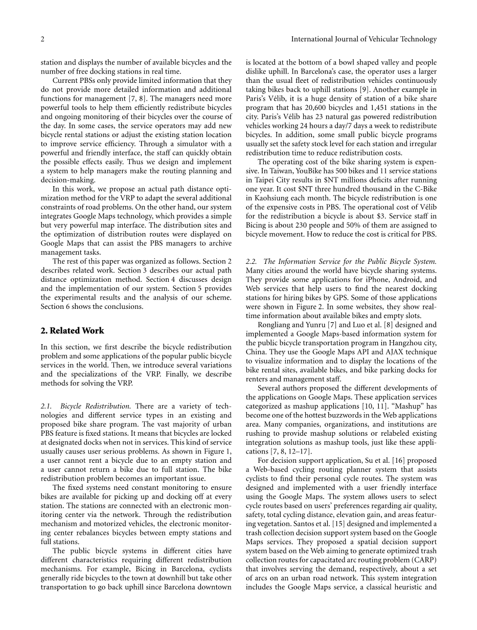 荣良、云如[7]和罗等。[8]设计并实现了基于谷歌地图的中国杭州市公共自行车交通项目信息系统。他们使用google maps api和ajax技术来可视化信息,并显示自行车租赁站点、可用自行车和自行车停车场的位置,供出租人和管理层使用。