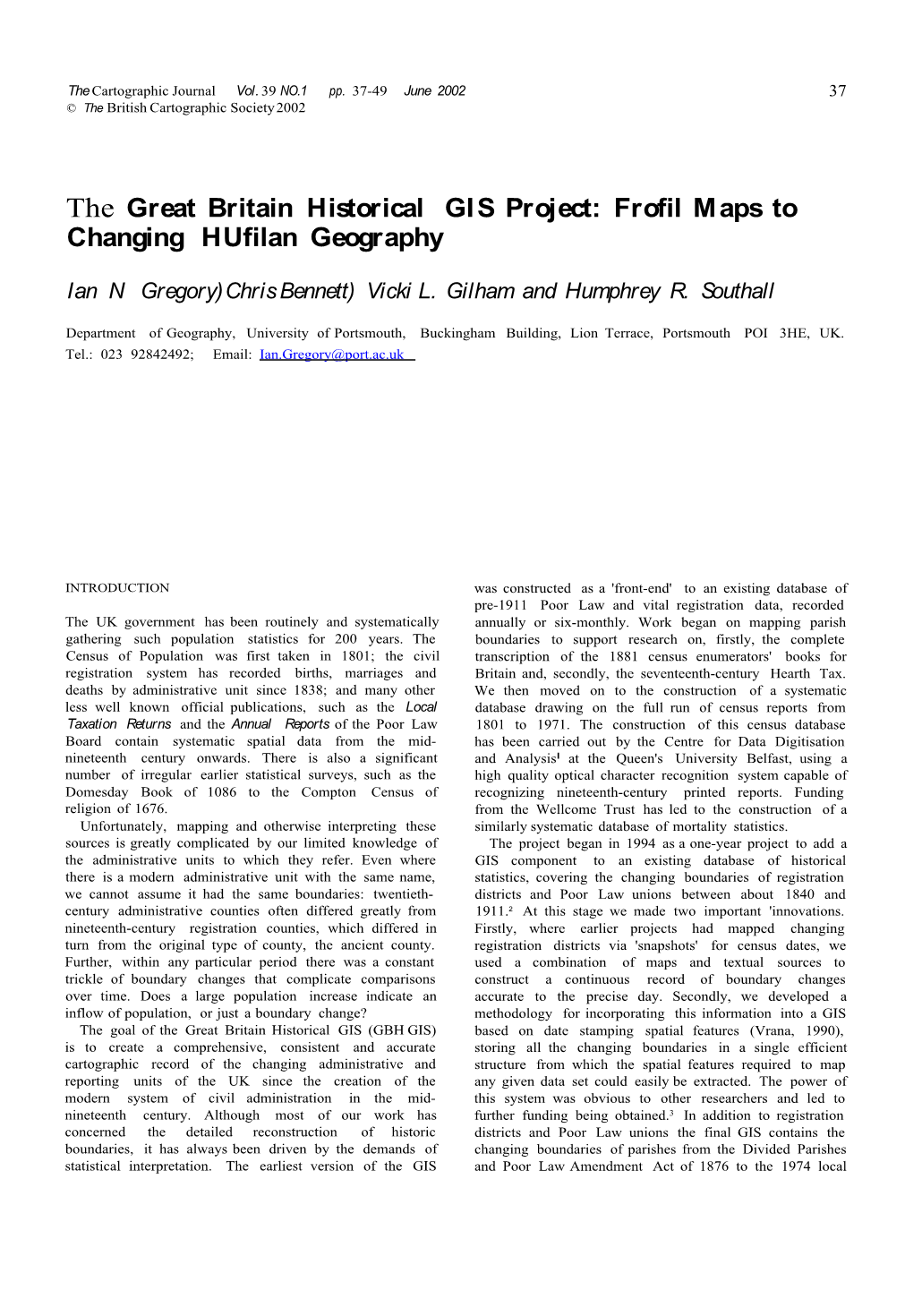 主要项目任务是为大不列颠建立专题的历史地理信息系统,用来展示过去两个世纪人类地理的进化。这个系统结合了管理地区的边界变化和历史统计的大量数据。这篇文章主要针对英格兰还有威尔士地区,在这些地方工业比较发达,并且考察测绘工作的资源,gis是如何建立的,以及GIS来标记过去地理的用途,还有利用包括圆顶日报19世纪中期边界来标记更早资源的潜力。