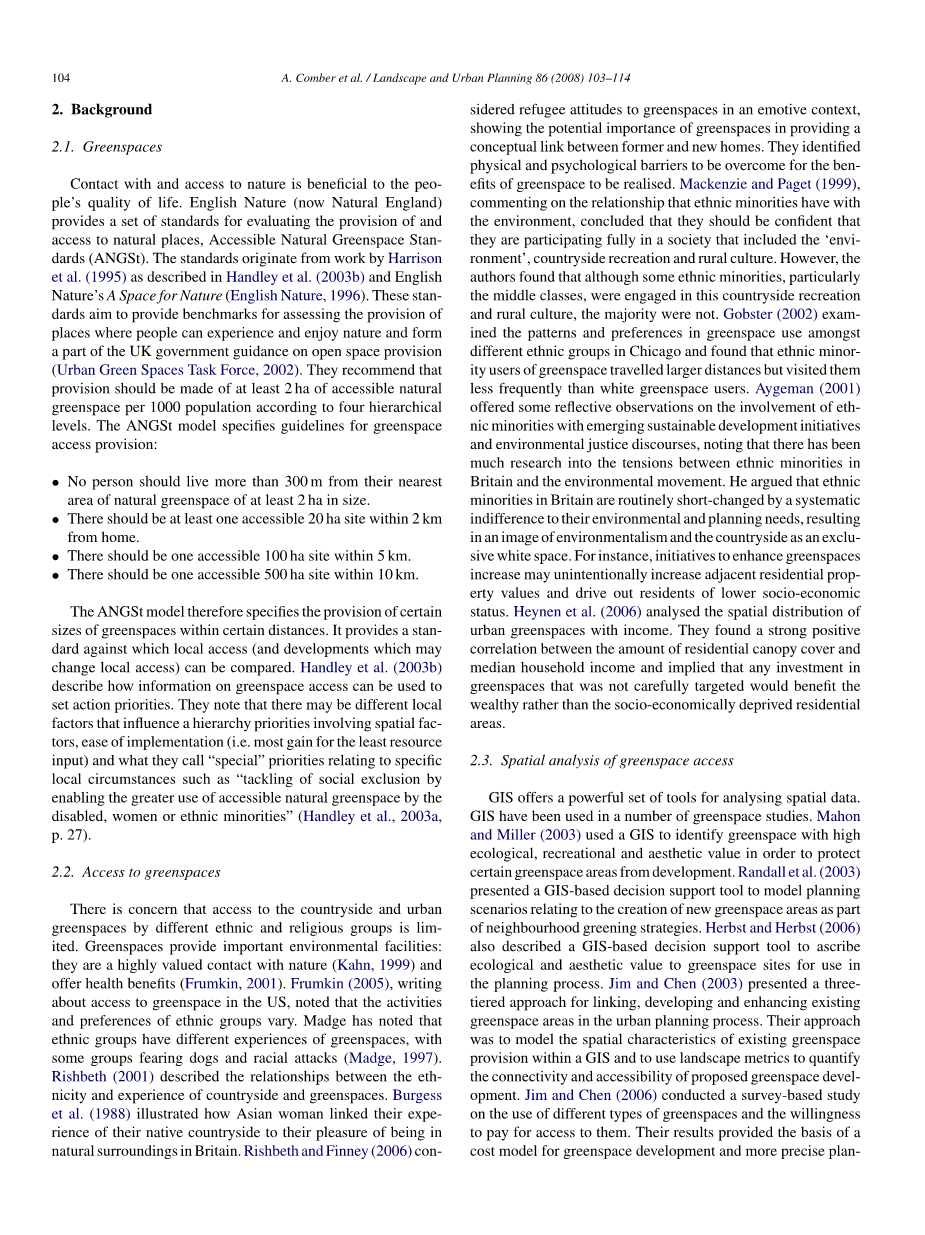 令人关切的是,不同种族和宗教团体进入农村和城市绿地的机会是有限的。绿地提供了重要的环境设施:它们是与自然高度珍贵的接触(Kahn, 1999),并提供健康效益(Frumkin, 2001)。Frumkin(2005)在关于美国进入绿地的文章中指出,不同种族群体的活动和偏好有所不同。Madge注意到,不同种族群体对绿地的体验不同,有些群体害怕狗和种族攻击(Madge, 1997)。Rishbeth(2001)描述了乡村和绿地的伦理性与体验之间的关系。Burgess等人(1988)阐述了亚洲女性如何将她们对本国乡村的体验与她们在英国自然环境中的快乐联系起来。利什贝斯和芬尼(2006)