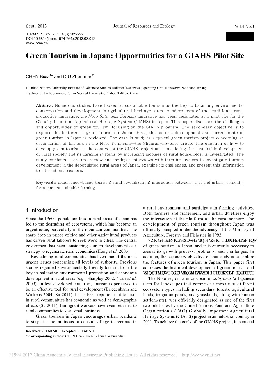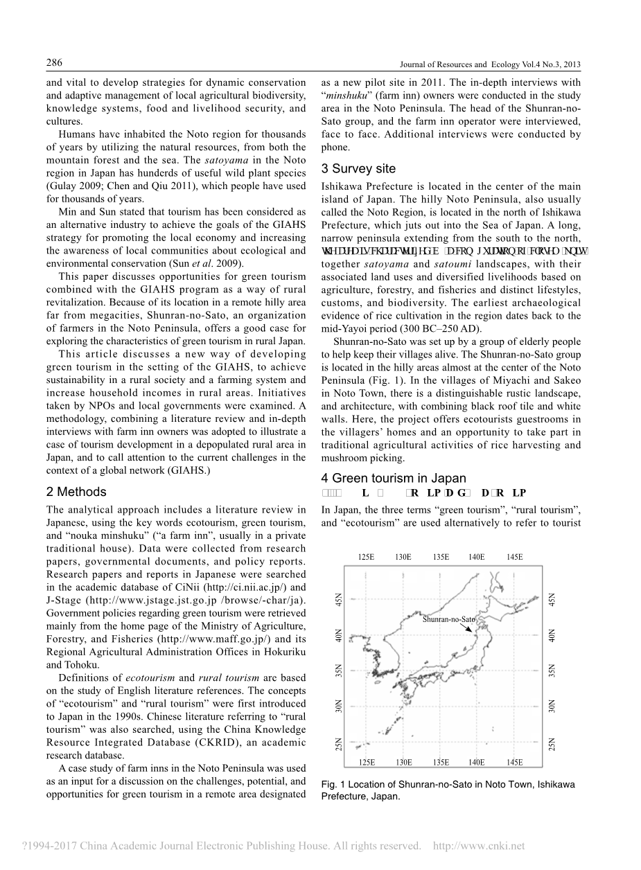 本文结合GIAHS项目探讨绿色旅游的发展机遇作为农村振兴之路,Shunran-no-Sato作为能都地区的一个农民组织,因为它位于远离大城市的偏远山区,为探索日本农村绿色旅游的特点提供了一个很好的案例。