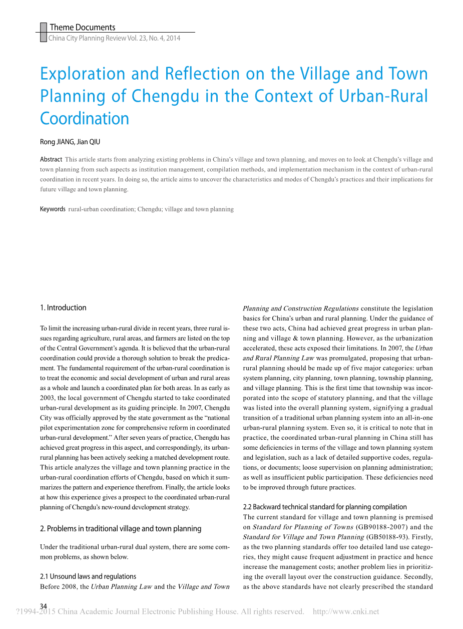 关键词:城乡协调;成都;村镇规划