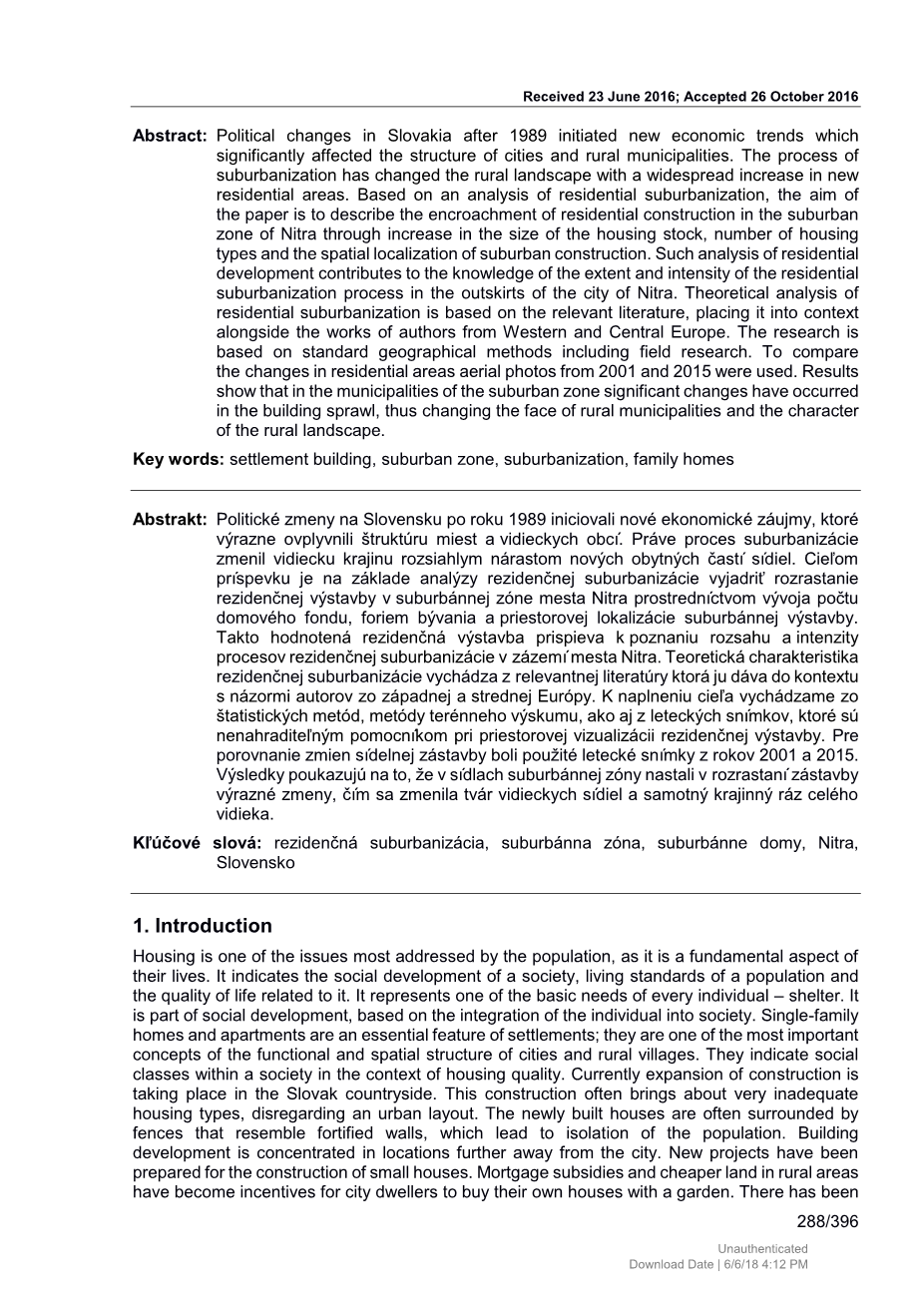 这种住宅建筑评估有助于了解尼特拉市周边住宅郊区化进程的程度和强度。 住宅郊区化的理论分析基于相关文献,并与西欧和中欧的作者的观点一起加入。 为了实现我们的目标,我们使用了统计方法和实地研究以及航拍照片,这些都是住宅建筑空间可视化不可或缺的辅助工具。