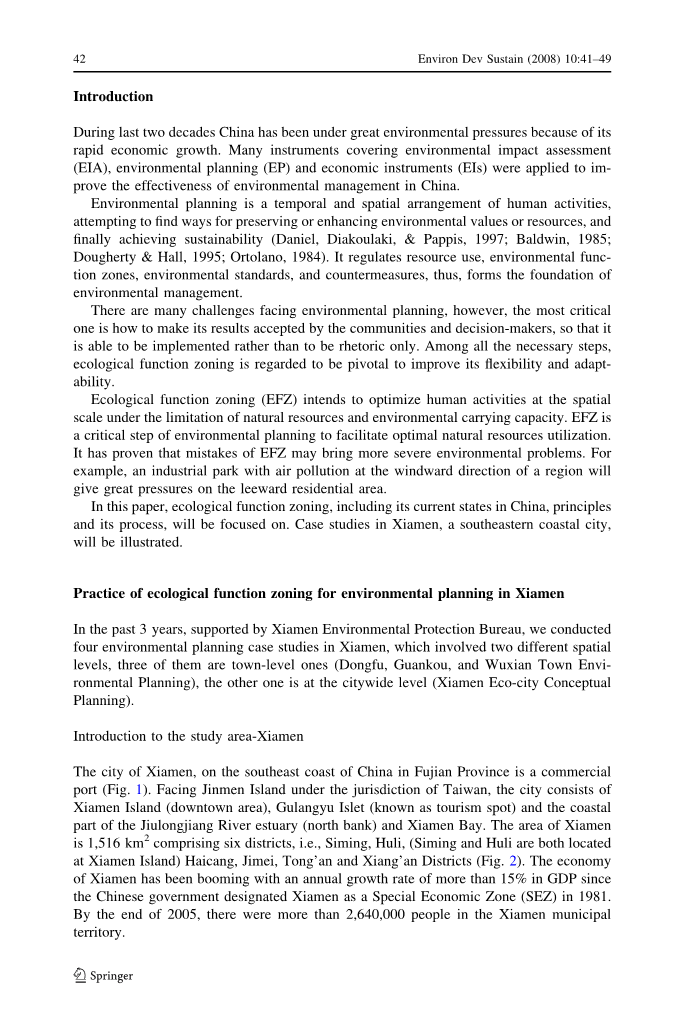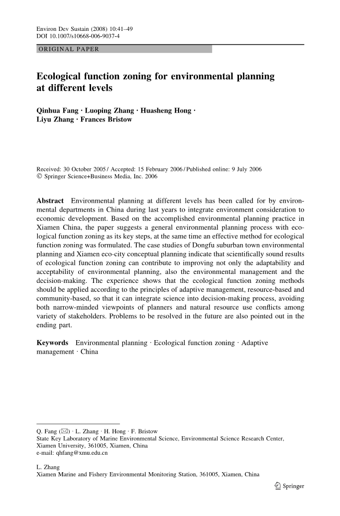 摘要 近年来,中国环境部门呼吁各级环境规划将环境考虑与经济发展相结合。基于中国厦门成功的环境规划实践,提出一个以生态功能区划为主要步骤的总体环境规划过程,同时制定了生态功能区划的有效方法。东府郊区城镇环境规划和厦门生态城市概念性规划案例研究表明,生态功能区划的科学完善的结果不仅有助于提高环境规划的适应性和可接受性,还有环境管理和决策。经验表明,应根据适应性管理原则应用生态功能区划方法,资源基础和社区为基础,以便它可以将科学融入决策过程,避免规划者狭隘的观点和各种利益相关者之间的自然资源利用冲突。结尾部分还指出了未来需要解决的问题。