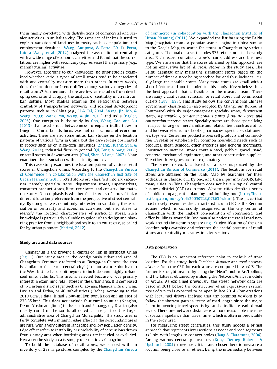 但是,根据我们的知识,以前没有研究过,不同类型的零售店是否往往与一个中心措施相关联。换言之,不同类别的零售店铺的选址偏好有何不同?此外,很少有发展中国家的案例研究应用intraurban的中心性分析。大多数研究考察了交通网络的中心性与中国等区域发展模式之间的关系(如李amp;蔡,2004;王,金,莫,amp;王,2009;王,墨,王,amp;金,2011)和印度(Bagler,2008)。有一个例外是,高、王、高和刘(2013)使用街道介入解释中国青岛的交通流量,但其重点不在经济活动的地点。对中国各公司的区位模式也进行了一些在城市内的研究,但案例研究在高技术产业(张、黄、孙、amp;王、2013)、一般工业企业等领域受到限制(齐、方amp;宋,2008)或商业区的零售商店(柴,沈,amp;长,2007)。没有审查与中心指数的联系。