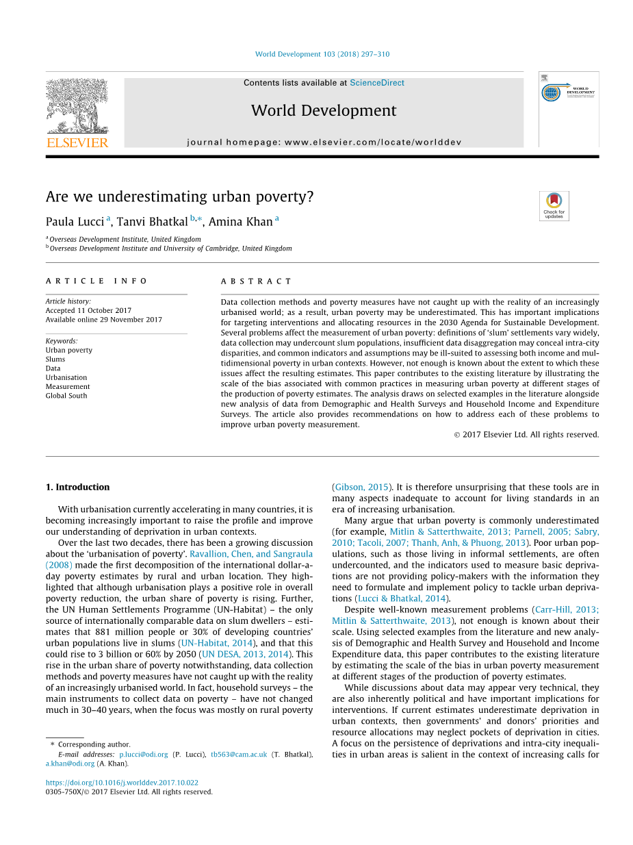 数据收集方法和贫困衡量方法并没有跟上日益城市化的世界的现实;因此,城市贫困往往是被我们低估的。这对在《2030年可持续发展议程》中针对干预和分配资源是具有重要影响的。一些问题影响了城市贫困的测量:“贫民窟”的定义有很大的差异,数据收集可能会低估贫民窟人口,数据的不集中可能掩盖城市内部的差异,共同的指标和假设可能不适合在城市环境中评估收入和多维贫困。然而,对这些问题影响结果估计的程度还不够。这篇论文通过说明在衡量不同阶段城市贫困的普遍做法所产生的偏差的程度对现有文献作出了贡献。该分析借鉴了文献中所选的例子,包括人口与健康调查和家庭收入和支出调查数据的新分析。文章还就如何解决这些问题提出了建议,以改善城市贫困状况。