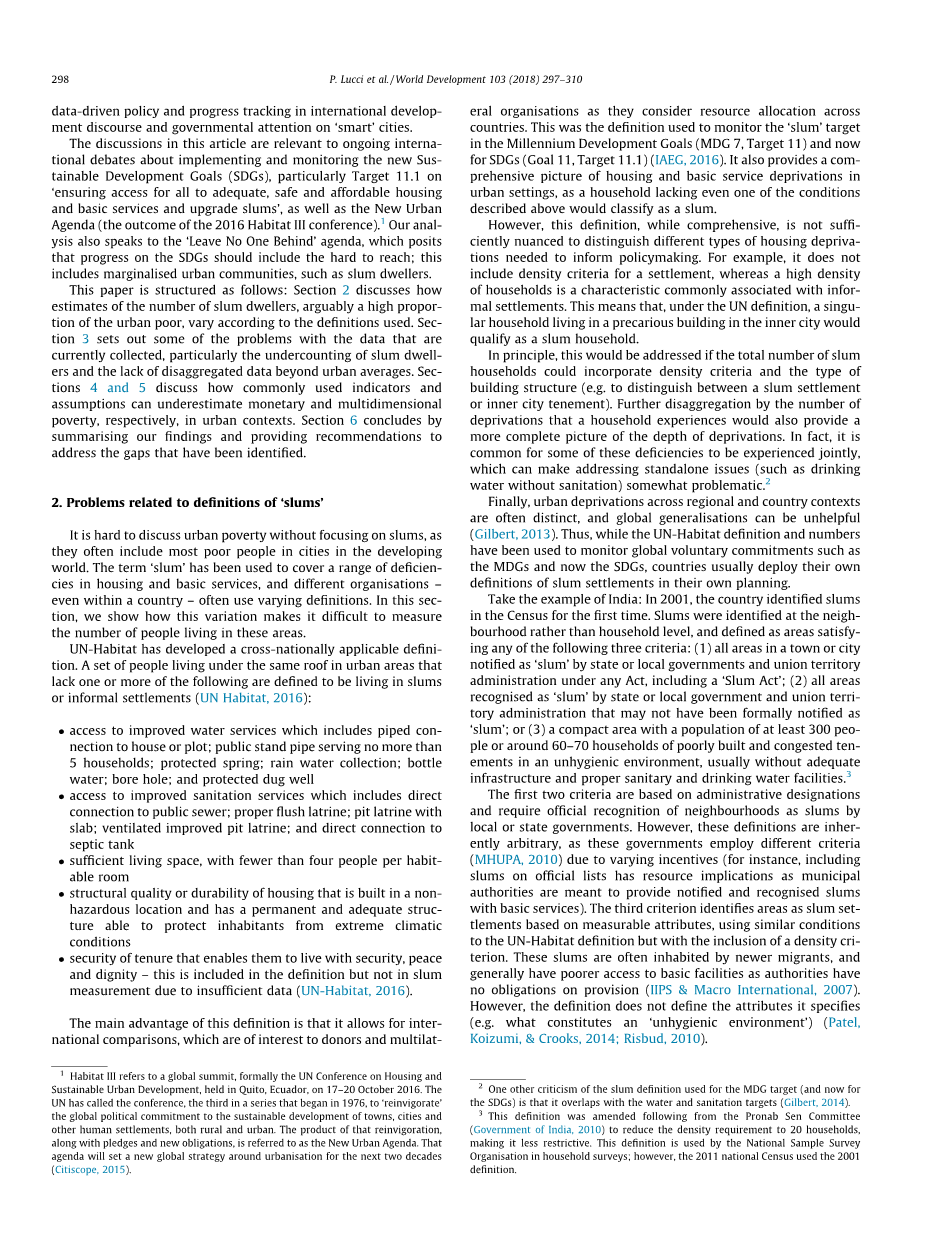 最后,在区域和国家背景下的城市剥夺通常是截然不同的,而全球化的一般化可能是没有帮助的(Gilbert, 2013)。因此,虽然联合国人居署的定义和数字已被用于监测全球自愿承诺,如千年发展目标和现在的可持续发展目标,但各国通常在自己的规划中部署贫民窟的定义。
