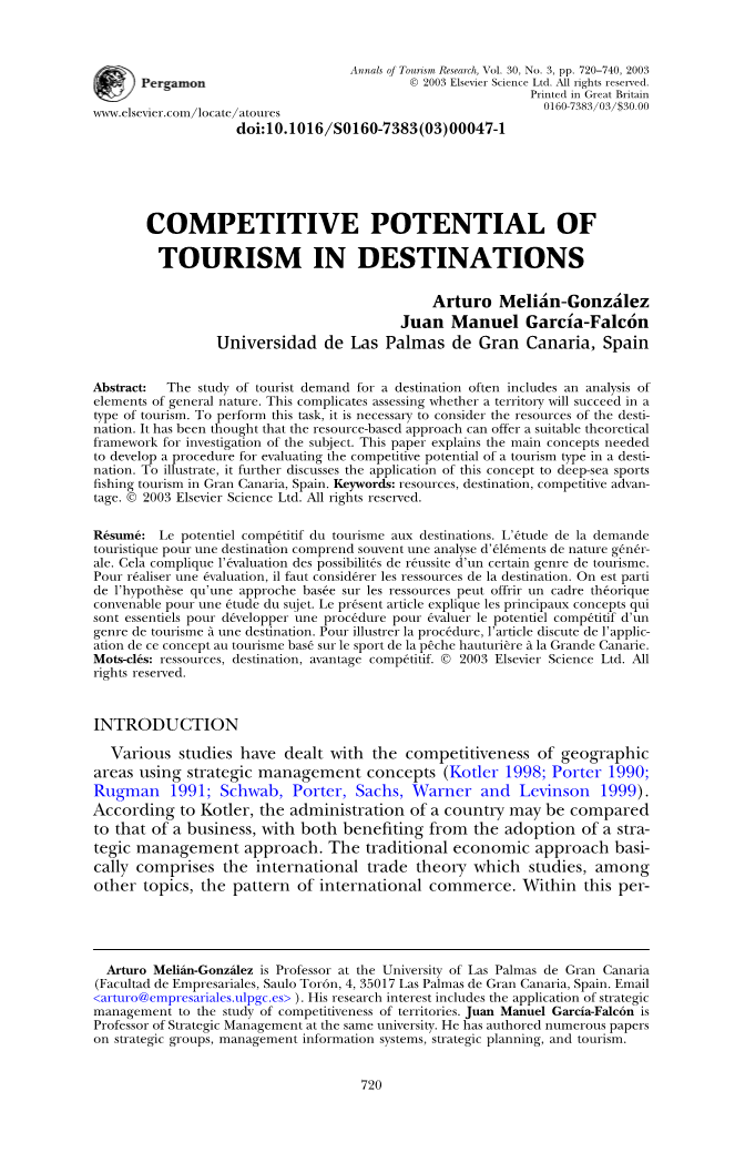 以资源为基础的理论(Penrose 1951;Wernerfelt 1984)则可能有助于确定某一特定地理区域内某一行业的竞争潜力。“地理区域”指的是拥有特定资源或能力的目的地,使其能够开展特定的经济活动。这种基于资源的视角用于对目的地的研究,是一种不同的分析角度,用于最初的公司是可行的,因为它们之间存在着许多相似之处:第一,在权力政治当局建立的目标上,可能会有一系列的目标;第二,他们拥有许多资源和能力用于进行某些经济活动,并且很可能符合这种理论方法所提出的特征;第三,它们受到特定环境的限制,如果要生存,它们必须适应这种环境(Melia n Gonza lez 2000)。在此基础上,本文的目的是应用资源和能力理论的概念,以评价某一旅游类型在目的地的竞争潜力。