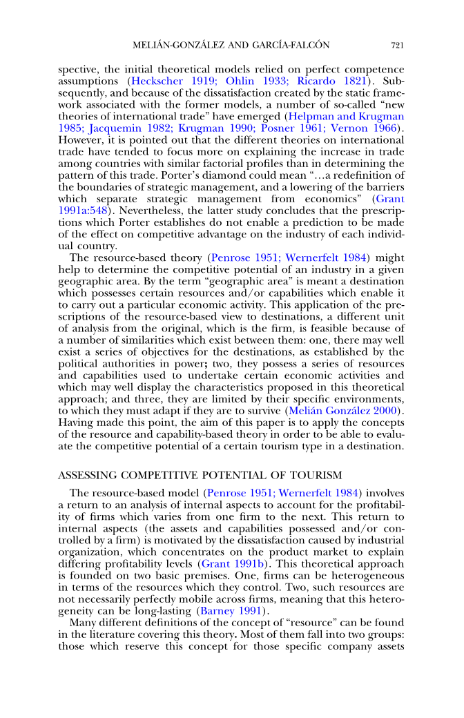 基于资源的理论认为,企业的竞争地位取决于一些独有的资源和它们之间的关系(Eisenhardt and Martin 2000; Fladmoe-Lindquist and Tallman 1994; Rumelt 1984)。一些使用此方法的研究得出结论,资产和能力条件可以成为持续竞争优势的来源。(Amit and Schoemaker 1993;Barney1991;Conner and Prahalad 1996;Dierickx and Cool 1989;Grant 1991b,1992;Peteraf 1993;Reed and DeFillippi 1990)。 正如巴尼和格兰特所指出的,资源必须是'有价值'的,因为它可以利用机遇或者消除威胁。此外,只有当相关资产“稀缺”时(换句话说,当它们在目的地不均匀时),它们的所有权才能导致竞争优势。为了维持这种不均匀的条件,资源或能力必须是“不可完全利用的”。Peteraf等人指出,当不可能获得资源时,一种选择就是创造它们。而且该资产必须没有替代品,因为开发特定经济活动的另一种选择是用战略上相当的资源取代这种有价值的资源(Barney 1991;Dierickx and Cool 1989)。 此外,产生持续竞争优势的资产必须是“不完全流动的”(Mahony and Pandian 1992;Peteraf 1993),因为目的地的资源流动涉及到一个区域的资源被分配到另一个地区的风险。这一理论模型在旅游业上的应用尤其恰当,原因有三。第一,正如Bull(1991)所言,这个行业是建立在一套资源基础上的,其中许多资源都具有短缺和流动性不足的特点。第二,如果从旅行目的的角度考察旅游类型的分类,可以推断出开发特定类型所需的资产和能力在每种情况下都是不同的(Mill and Morrison 1985;Rafferty 1993;Smith 1977;Valls 1996;Wahab 1975)。第三,这些资源都是由大量的资产组成的,因为旅游涵盖各种各样的活动 (Inskeep 1991;Smith 1994)。