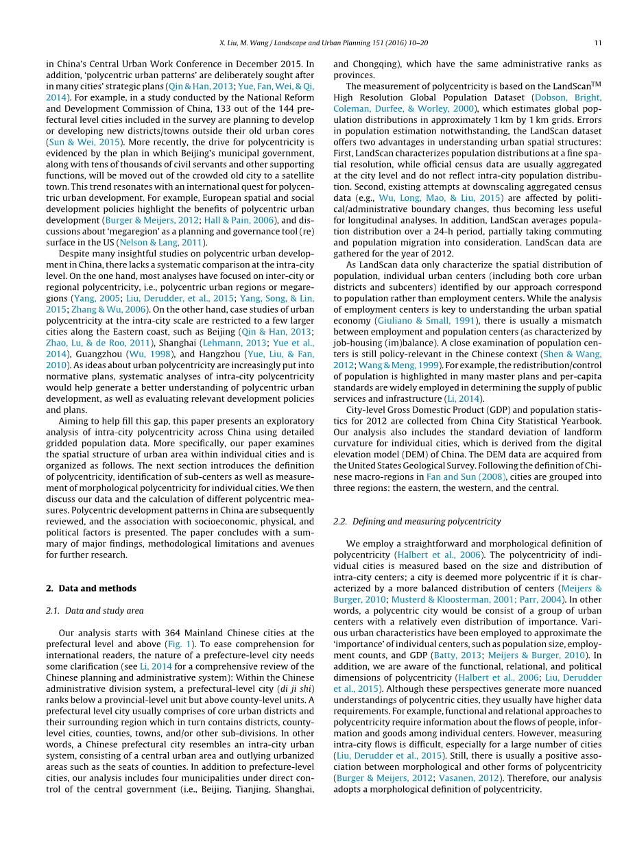 尽管学术界对中国城市的多中心发展已有很多研究,但是从城市内部层面来比较多中心格局仍然缺乏系统性的研究。一方面,大多数分析都集中在城市之间或者区域多中心,即多中心城区或大都市区(Yang,2005; Liu,Derudder等,2015; Yang,Songamp;Lin,2015; Zhangamp; 吴,2006)。另一方面,在城市内尺度的多中心城市研究案例多局限于东部沿海的几个较大的城市,如北京(Qinamp;Han,2013; Zhao,Lu,amp;de Roo,2011),上海 (Lehmann,2013; Yue等,2014),广州(Wu,1998)和杭州(Yue,Liu,amp;Fan,2010) 随着城市多中心越来越广泛地纳入规范计划,对城市内多中心的系统分析将有助于更好地理解多中心城市发展,并用于评估相关的发展政策和计划。
