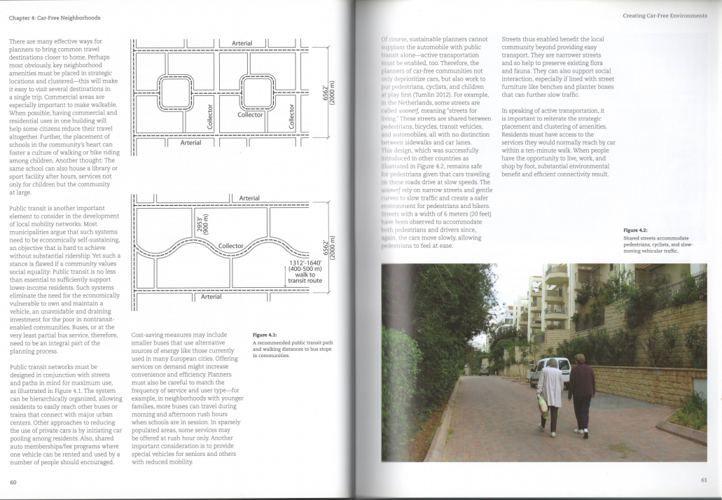 当然,可持续发展的规划者也不能用公共交通来代替汽车,只有公共交通才能进行主动运输。因此,无车区的规划者不仅剥夺了汽车,而且还让行人、骑自行车者和儿童玩耍。第一次(Tumlin,2012年)。例如,在荷兰,有些街道让人想起了Woonerf,意思是“街道就是生活”。这些街道由行人、自行车、过境车辆和汽车共用,没有人行道和汽车的区别。这种设计在其他国家成功采用,如图4.2所示,但由于车辆在这些道路上行驶速度较慢,因此对行人来说仍然是安全的。它依靠狭窄的街道和温和的人群来减缓交通,为行人和骑自行车的人创造更安全的环境。从汽车再一次开始,人们就观察到宽度为6米(20英尺)的街道可以容纳行人和司机慢慢移动,让行人感到自在。