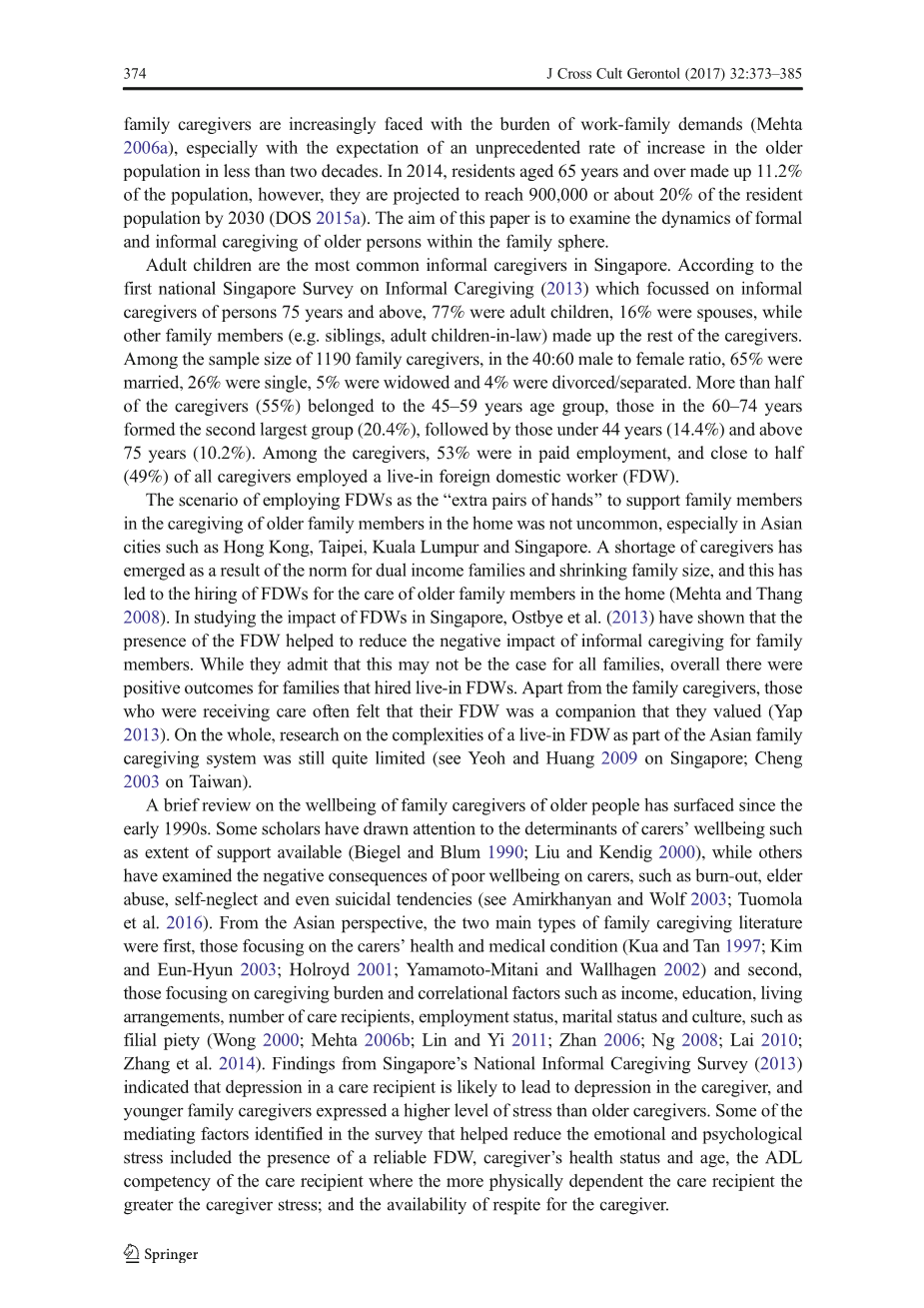 自1990年代初以来,对老年人的家庭照顾者的福祉的简短评论浮出水面。 一些学者提请注意护理人员幸福感的决定因素,例如可得到的支持程度(Biegel和Blum 1990; Liu和Kendig 2000),而另一些学者则研究了护理不佳对护理人员的负面影响,例如倦怠,长者。 虐待,自我忽视甚至自杀倾向(见Amirkhanyan和Wolf 2003; Tuomola等人2016)。 从亚洲人的角度来看,家庭照料文献主要分为两种类型,即关注照料者的健康和医疗状况的文献(Kua和Tan,1997; Kim和Eun-Hyun,2003; Holroyd,2001; Yamamoto-Mitani和Wallhagen,2002)。 其次,那些关注照料负担和相关因素的人,例如收入,教育,生活安排,接受照料者的人数,就业状况,婚姻状况和文化,例如孝顺(Wong 2000; Mehta 2006b; Lin and Yi 2011; Zhan 2006 ; Ng 2008; Lai 2010; Zhang et al.2014)。 新加坡全国非正式照料调查(2013)的结果表明,被照料者的抑郁症很可能导致照料者的抑郁,与年长的照料者相比,年轻的家庭照料者表现出更高的压力水平。 调查中确定的有助于减轻情绪和心理压力的一些中介因素包括:可靠的外籍家政工人,看护人的健康状况和年龄,看护人的ADL能力,其中对看护人的身体依赖性越强,看护人越多强调; 以及照顾者的休息机会。