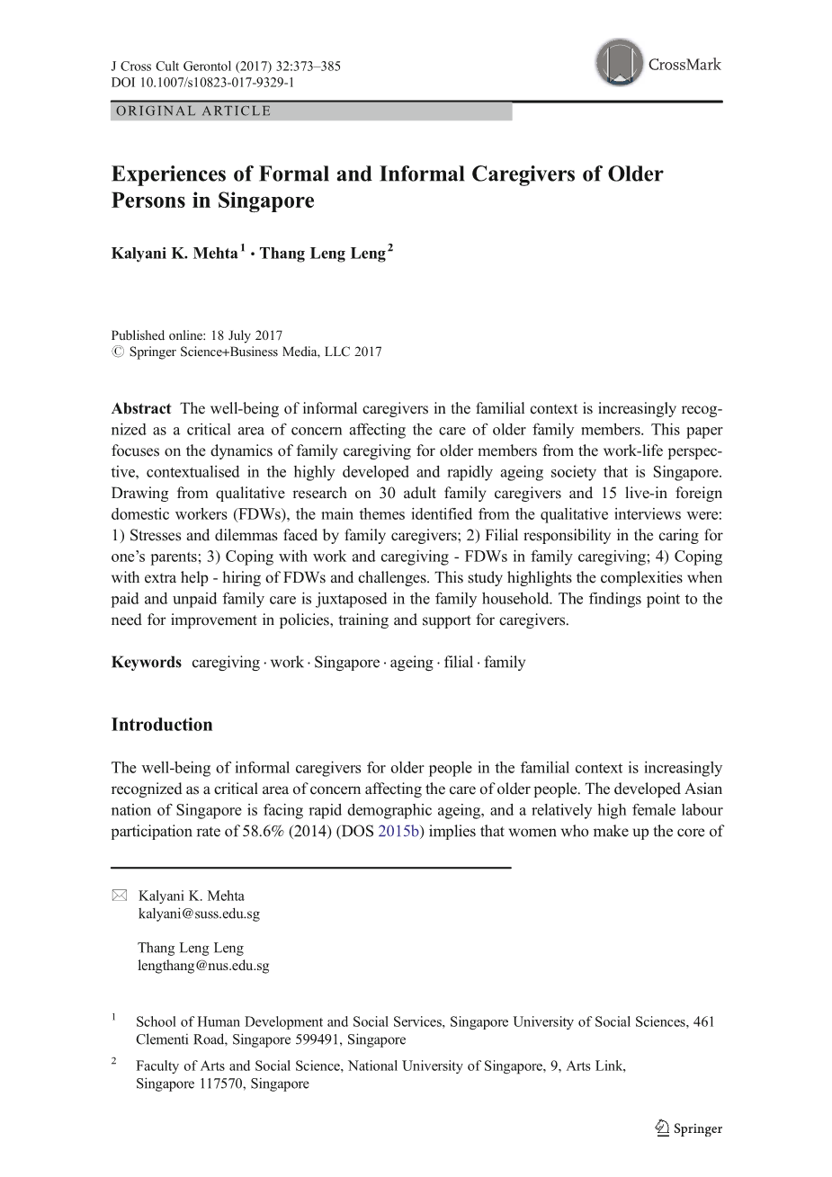 在家庭背景下,老年人的非正式照料者的福祉日益被认为是影响老年人照料的重要关切领域。亚洲发达的新加坡国家正面临着快速的人口老龄化,女性劳动参与率相对较高,为58.6%(2014)(DOS 2015b),这意味着构成家庭照顾者核心的女性越来越多地面临工作负担, 家庭需求(Mehta 2006a),尤其是在不到二十年的时间里,老年人口的空前增长的预期。 2014年,年龄在65岁及以上的居民占人口的11.2%,但预计到2030年将达到90万,约占居民人口的20%(DOS 2015a)。 本文的目的是研究家庭领域内老年人正式和非正式照料的动态。