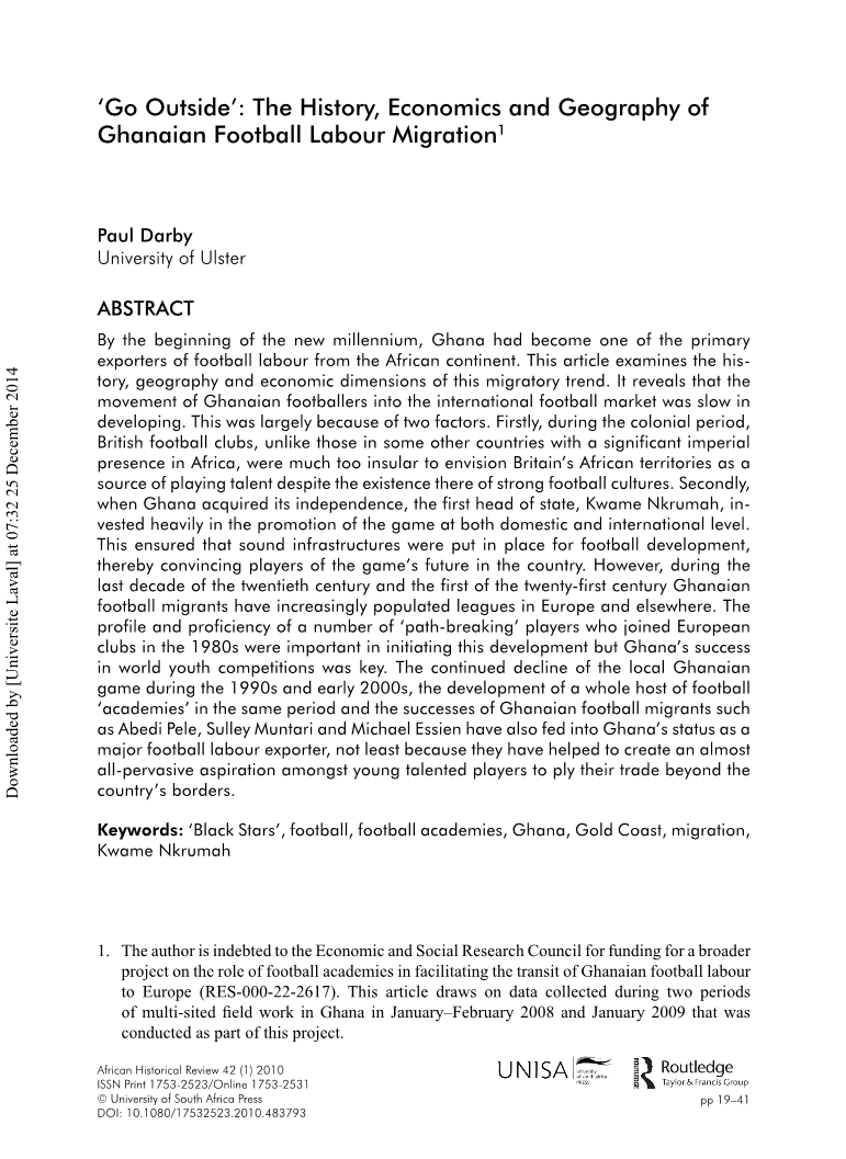 摘要:到新千年之初,加纳已成为非洲大陆足球劳务的主要出口国之一。本文研究了这种迁徙趋势的历史,地理和经济方面。它表明,加纳足球运动员进入国际足球市场的发展缓慢。这主要是由于两个因素。首先,在殖民时期,英国足球俱乐部与其他一些在非洲拥有重要帝国地位的国家的足球俱乐部不同,尽管存在着浓厚的足球文化,但英国的足球俱乐部实在太孤立了,无法将英国在非洲的殖民地设想为发挥才华的来源地。其次,当加纳获得独立时,第一任国家元首克瓦米·恩克鲁玛投入了大量精力在国内和国际上推广该游戏。这确保了足球发展所需要的完善的基础设施,从而使球员们信服,在国家有发展前景。但是,在20世纪的最后十年和21世纪初,加纳的足球移民在欧洲和其他地方的联赛越来越多。在1980年代加入欧洲俱乐部的许多“开拓性”球员的形象和熟练程度对启动这种发展至关重要,但加纳在世界青年比赛中的成功也是至关重要的。在1990年代和2000年代初期,加纳当地足球比赛的持续衰落,同一时期整个足球运动的发展,以及阿贝迪·贝利,苏利·蒙塔里和迈克尔·埃辛等加纳足球移民的成功都致使加纳获得主要的足球劳务输出国的地位,不仅仅是因为它们帮助年轻且才华横溢的球员创造出几乎无所不在的渴望来扩大其在境外的贸易。
