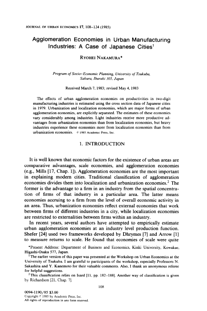 利用1979年日本城市截面数据,估算了城市群经济对两位数制造业生产率的影响。城市化与地方化是城市群经济的主要表现形式,二者之间存在着明显的差异。对这些经济体的估计因行业而异。轻工业从城市化经济中比从地方化经济中获得更多的生产力优势,而重工业从地方化经济中比从城市化经济中获得更多的生产力优势。1985年学术出版社。