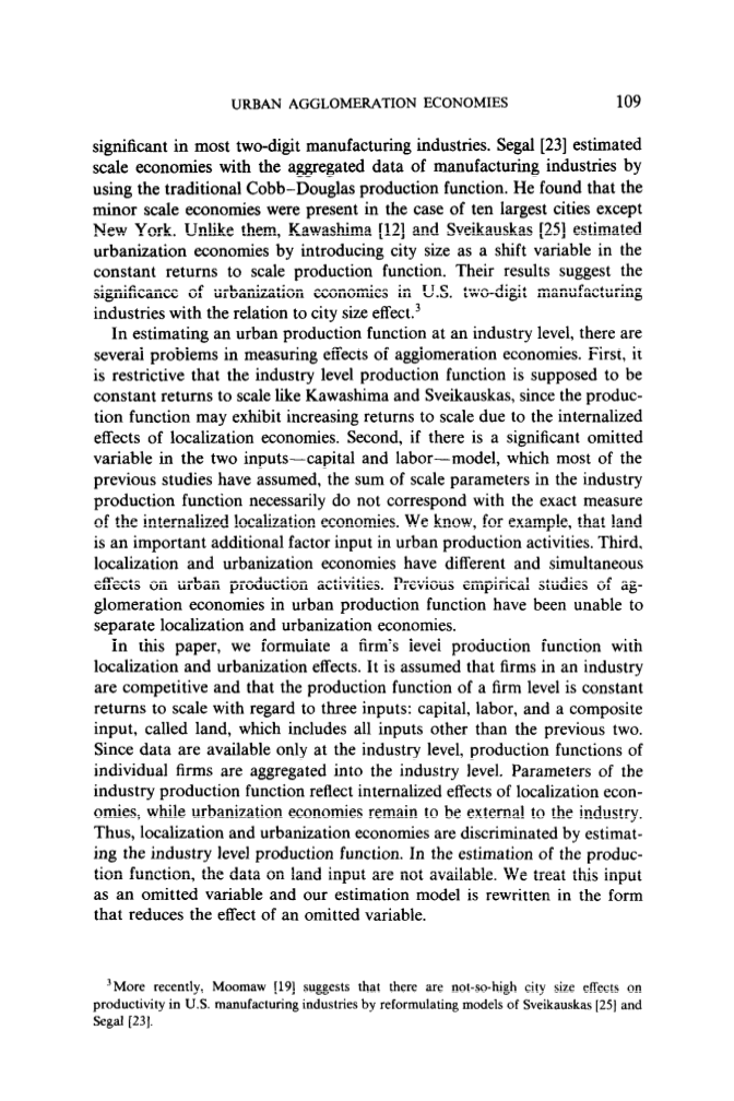 3最近,Moomaw[19]通过重新制定Sveikauskas[25]和Segal[23]的模型,表明城市规模对美国制造业生产率的影响并没有那么大。