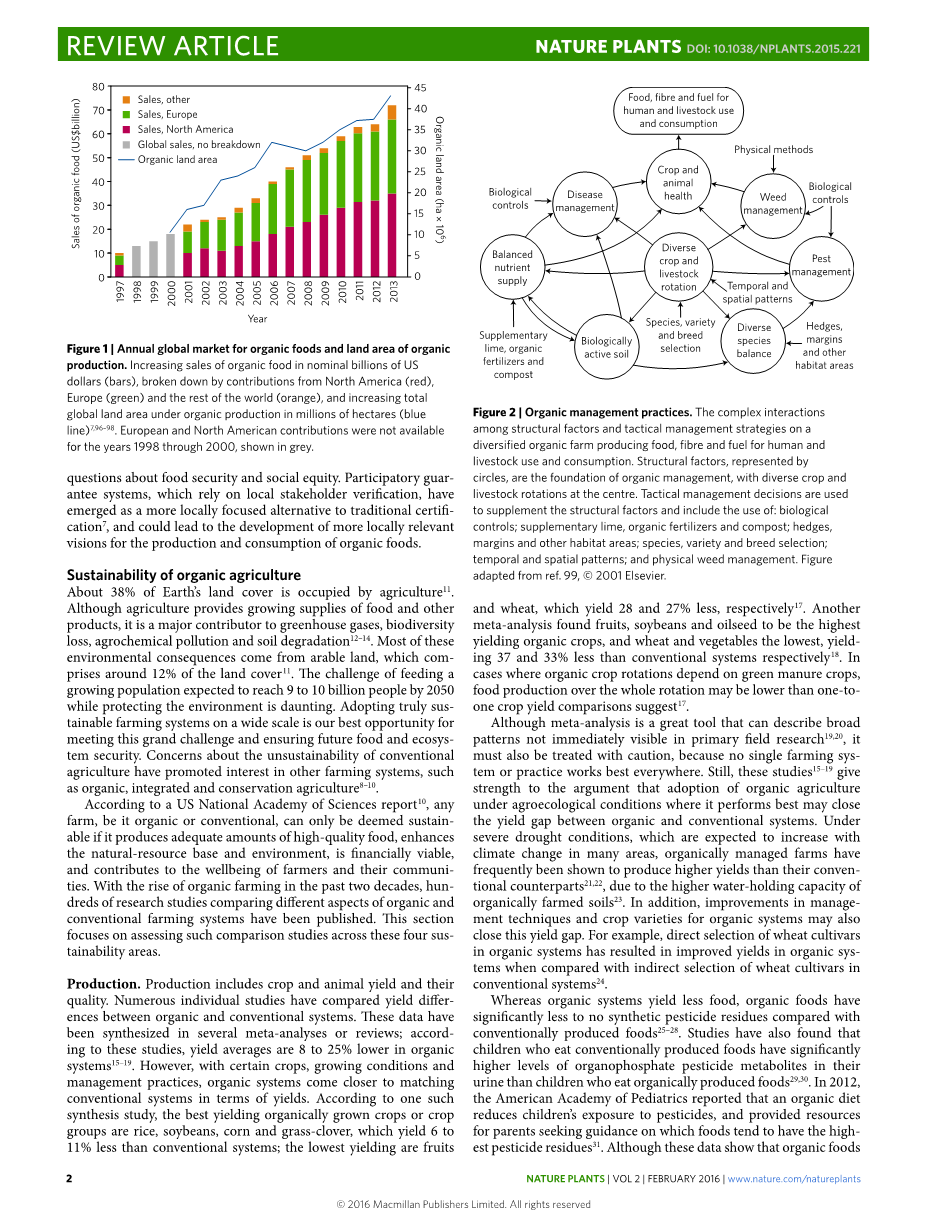 有机农业发展是有争议的。是20世纪70年代和80年代代表许多农民和科学家的普遍态度,这是1971年当时的美国农业部长厄尔·布茨说的“没有同情心的话语”:”在我们回到有机农业之前在这个国家,有人必须决定哪五千万美国人会饿死或挨饿”在二十一世纪之交,怀疑论者认为有机农业是意识形态驱动和无效的[2,3]。他们有人认为有机农业在更多的土地上生产与传统农业相同数量的粮食,并且采用规模过大的有机农业可能会威胁世界的森林,湿地和草原[2,3]。他还断言,有机农业有缺点和农业问题的解决方案很差[2,4]。一些批评者认为,有机农业是粮食安全的有效方法[5,6]以及未来将变得不那么重要的农业系统[6]。然而,有机农场的数量,有机农业的范围,用于有机农业的研究经费和有机食品的市场规模稳步增加[7]。有机食品和饮料的销售正在快速增长,在1999年至2013年间增加了超过720亿美元(见参考文献7;图1);预计到2013年,这一预测将翻一番。此外,最近的国际报告认为有机农业是一种创新的农业系统,可以平衡多个可持续发展目标,并将在全球粮食和生态系统安全中日益重要[8-10]。在这里,我们回顾一下在可持续性指标和全球挑战的背景下,有机农业系统的表现,以及采用有机农业系统的一些障碍以及克服它们所需的政策。