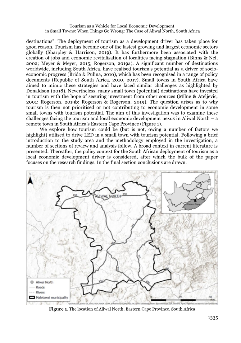 在最近一本关于南非小城镇旅游发展的书中,Donaldson(2018:7)发表了以下评论:“旅游业发展是发展中国家和发达国家同等重要的主题,而大都市地区正处于(或保持)全球竞争力的地位,许多城镇因其相对于大都市区的位置而难以生存,提供的服务严重不足,缺乏称职的城市管理,而其他城镇则已转变为繁荣的当地后生产(以农业为导向)经济体,成为充满活力的旅游目的地”。旅游业作为发展动力的部署是有充分理由的。旅游业已成为全球增长最快、规模最大的经济部门之一(Sharpleyamp;Harrison,2019)。此外,它还与创造就业和经济复苏面临停滞的地方(Binnsamp;Nel,2002;Meyeramp;Meyer,2015;Rogerson,2019a)联系在一起。包括南非在内的全球许多旅游目的地已经意识到旅游业作为社会经济进步驱动力的潜力(Bridaamp;Pulina,2010),这一点已在一系列政策文件中得到确认(南非共和国,2010,2017)。南非的小城镇旨在模仿这些战略,并面临Donaldson(2018)强调的类似挑战。尽管如此,许多小镇(潜在的)目的地都投资于旅游业,希望从其他渠道获得投资(Milneamp;Ateljevic,2001;Rogerson,2019 b;Rogersonamp;Rogerson,2019)。由此产生的问题是,为什么旅游业在一些具有旅游潜力的小城镇没有得到优先考虑,或者没有对经济发展作出贡献。本次调查的目的是研究北阿利沃旅游业和当地经济发展关系面临的这些挑战,北阿利沃是南非东开普省的一个偏远城镇(图1)。