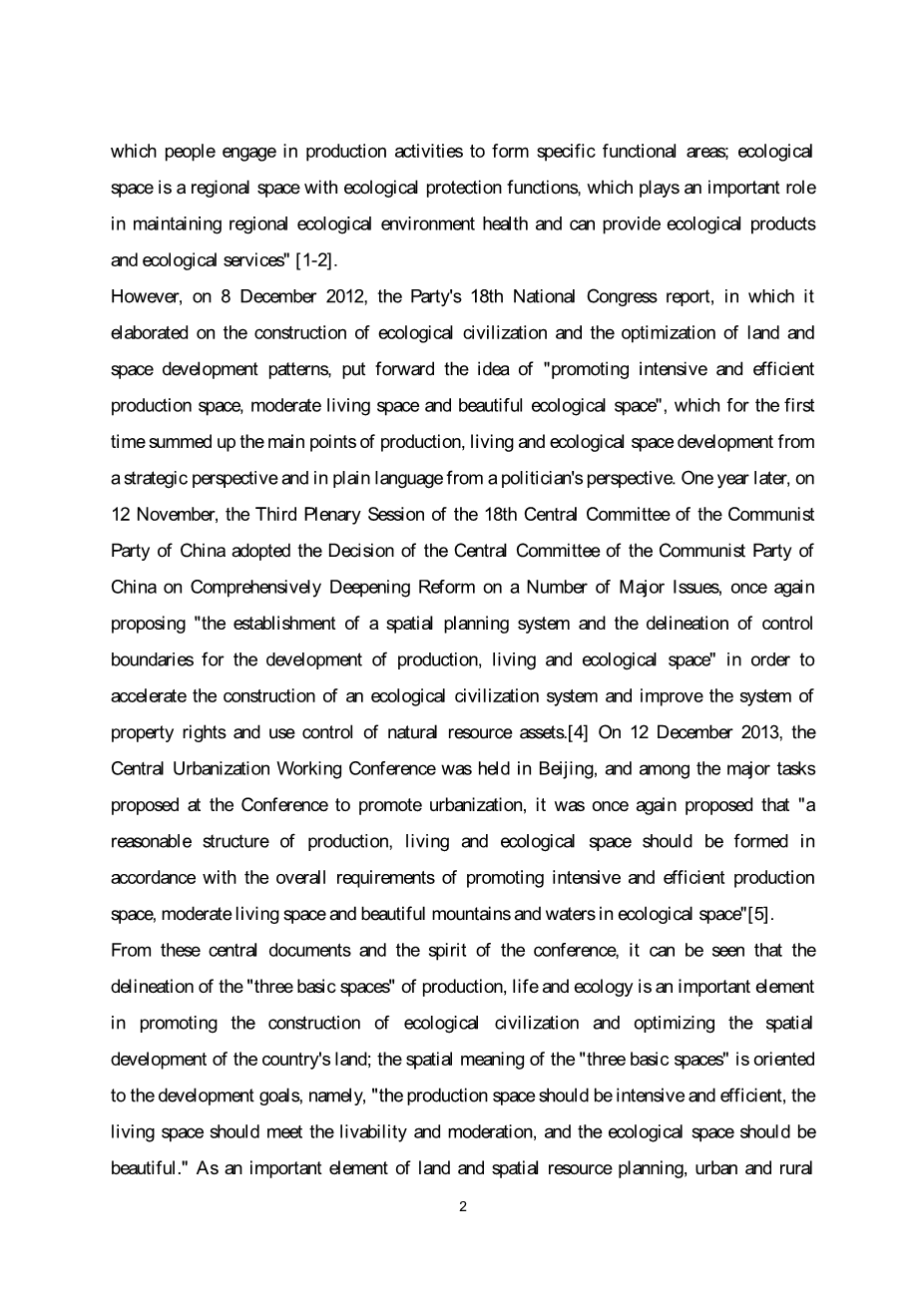 然而,2012年12月8日党的十八大报告在阐述生态文明建设,优化国土空间开发格局中提出“促进生产空间集约高效、生活空间宜居适度、生态空间山清水秀”,第一次以政治家的视角从战略的高度、用通俗易懂的语言总结出了生产、生活、生态空间的发展要义。一年后的11月12日十八届三中全会通过了《中共中央关于全面深化改革若干重大问题的决定》,又一次在加快生态文明制度建设,健全自然资源资产产权制度和用途管制制度中提出“建立空间规划体系,划定生产、生活、生态空间开发管制界限”[4]。2013年12月12日,中央城镇化工作会议在北京召开,在会议提出的推进城镇化的主要任务中,再一次提出“提高城镇建设用地利用效率 按照促进生产空间集约高效、生活空间宜居适度、生态空间山清水秀的总体要求,形成生产、生活、生态空间的合理结构”[5]。