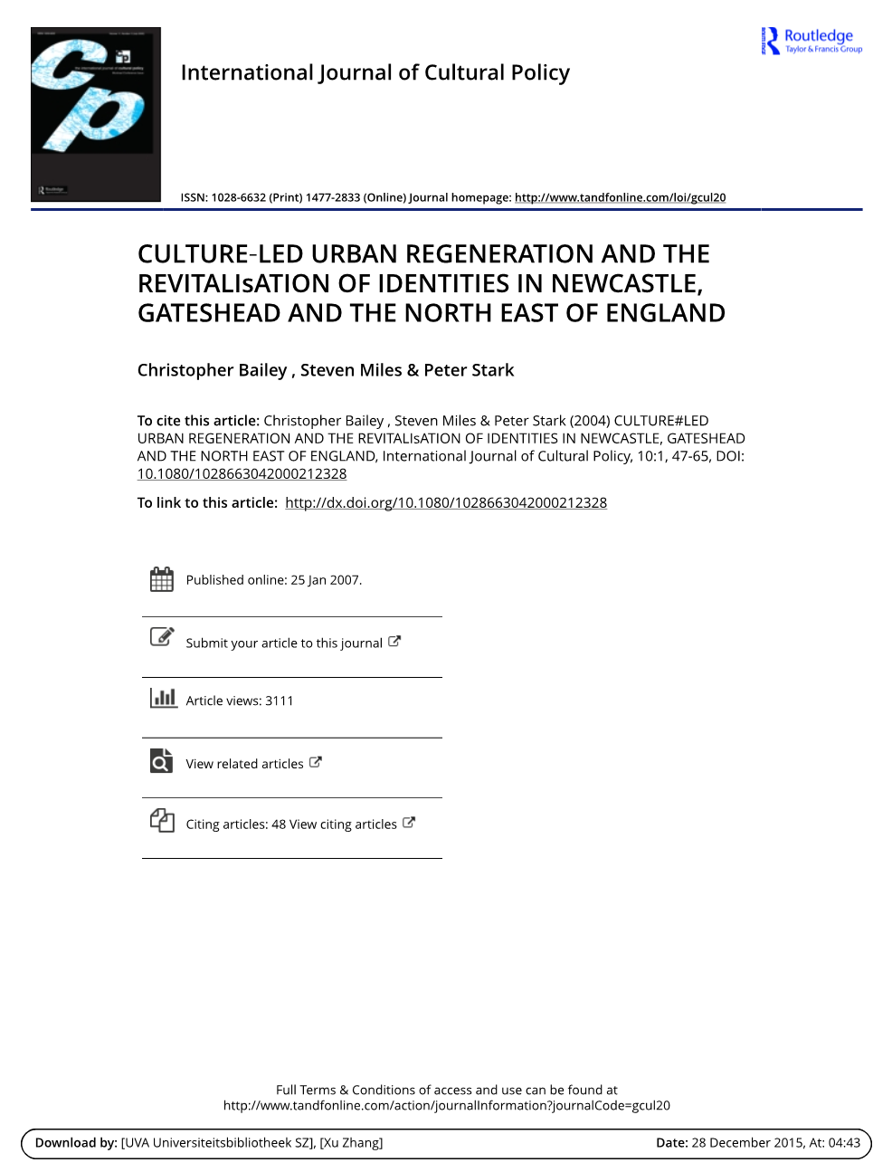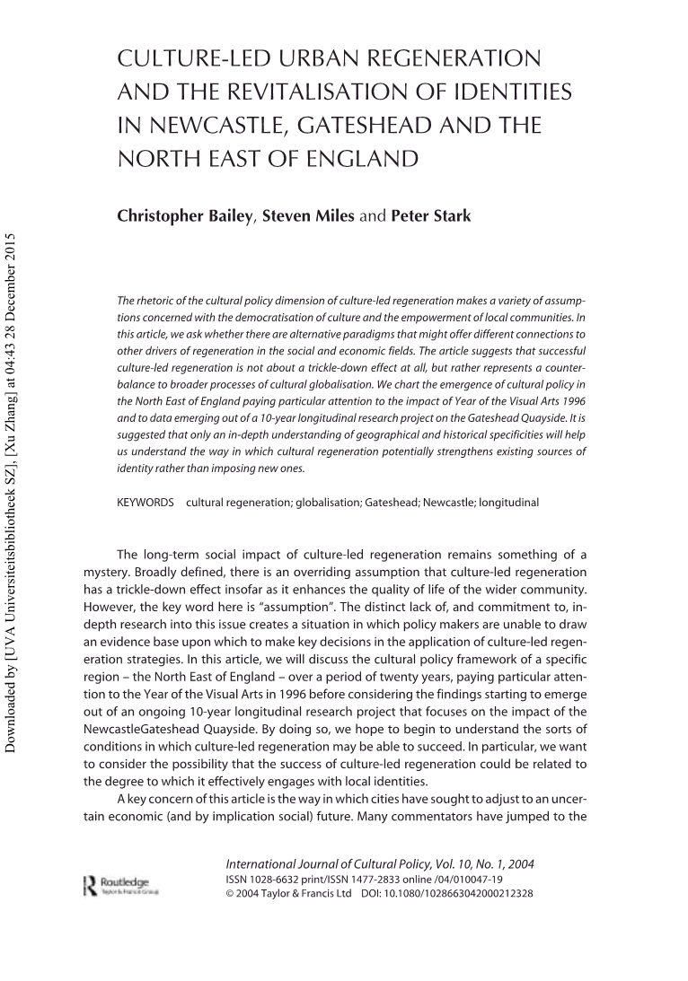引用文章:克里斯托弗·贝利,史蒂芬·麦尔,彼得·斯塔克(2004年)以文化为导向的城市再生和身份的复兴——在英格兰东北部的纽卡斯尔,盖茨黑德,国际期刊文化政策,10:1,47-65,DOI:10.1080/1028663042000212328