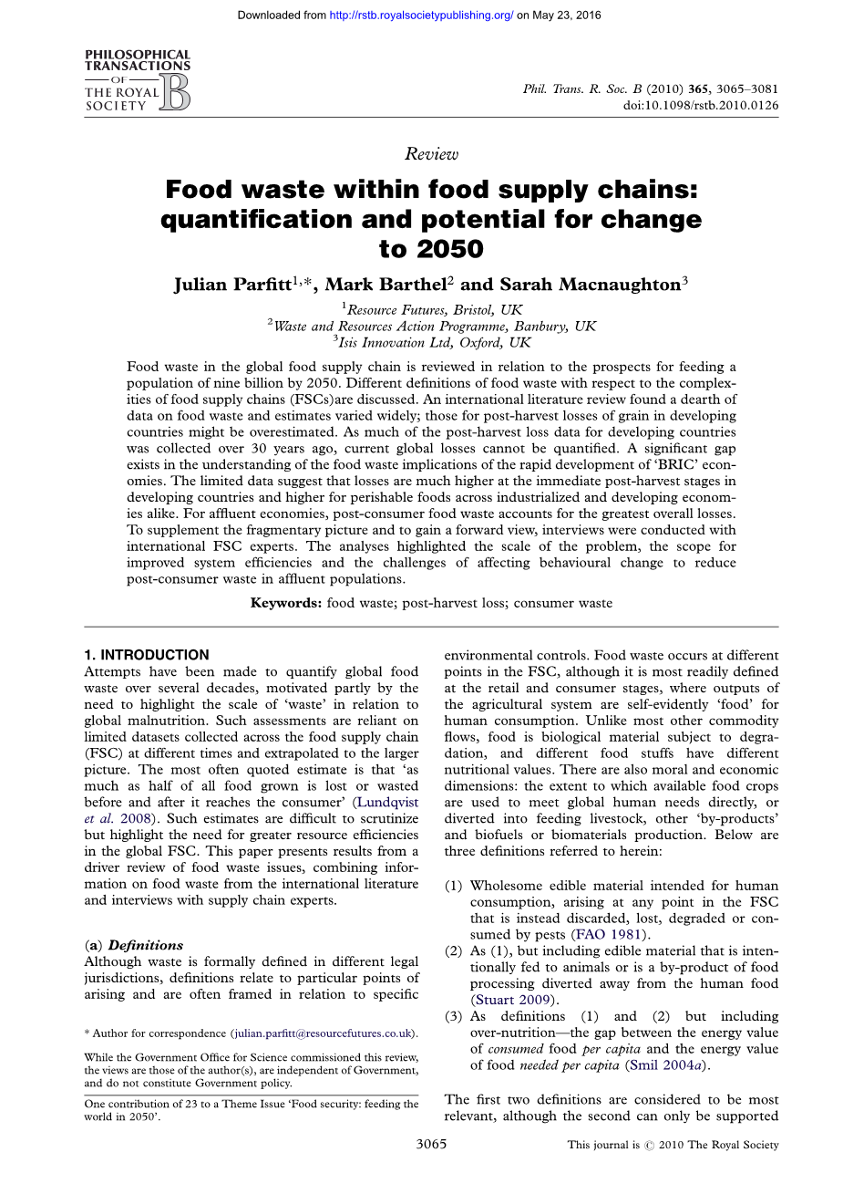 食品在FSC过程中的浪费是很多因素的共同作用结果:市场经济,资源限制和气候,法规和文化差异仅仅是其中的一部分。我们列出了在定义和量化这种浪费时的困难并且描述生产废物在发展、过渡和发展的世界中有什么不同。在这里我们讨论在未来可能推动废弃物的产生的趋势,那可能是最有潜力减少食物垃圾在发展中国家和发达国家发生的趋势,还有什么政策和系统可能餐厨垃圾减少直到2050年。