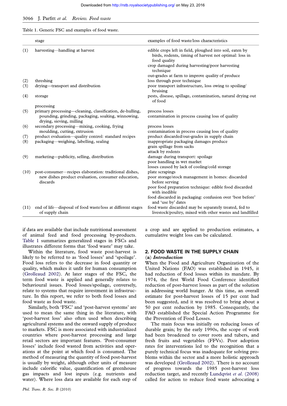 在文献中,收获后的食物浪费被称为“食物损失”和“变质”。食物损失指的是减少食物量或质量,这使得它不适合人类食用(Grolleaud2002)。在FSC的后期阶段,食物浪费问题通常和一些行为相关。粮食损失/腐败变质,反过来说,涉及到一些基础设施方面的投资建设。在这份报告中,我们所说的食物浪费既包括食品损失,又包括食物浪费。