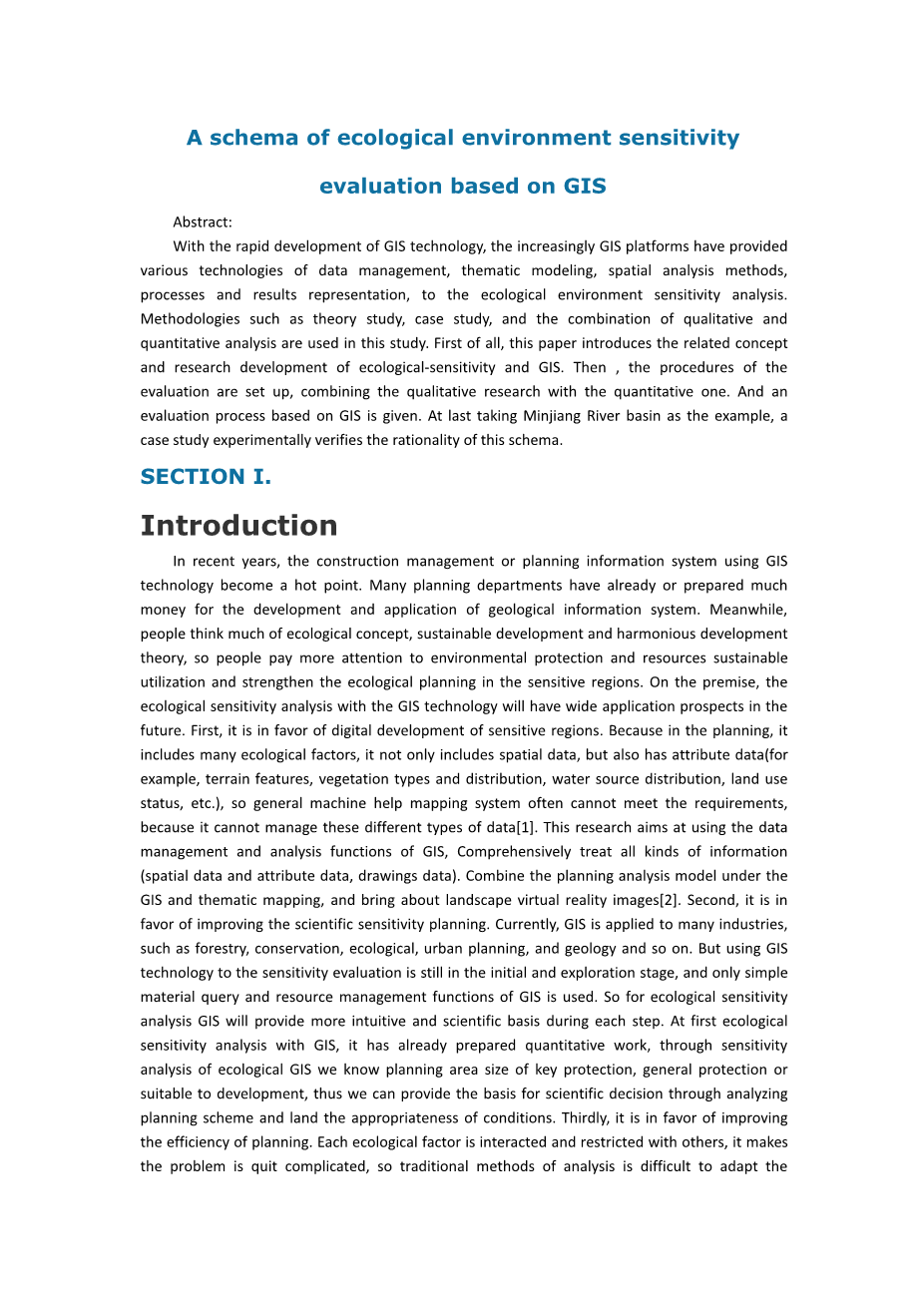 摘要:随着GIS技术的快速发展,越来越多的GIS平台提供了各种关于数据管理、主题建模、空间分析方法、过程和结果表示等技术用于生态环境敏感性分析。 一些方法论例如理论研究、案例研究和定性和定量相结合的分析都被用于这项研究。 首先,这篇论文介绍了相关概念以及生态敏感性和GIS的研究进展。 然后,结合定性与定量的研究建立评价的程序,最终得到一个基于GIS的评估过程。 最后以岷江流域为例,以一个案例研究实验验证该模式的合理性。