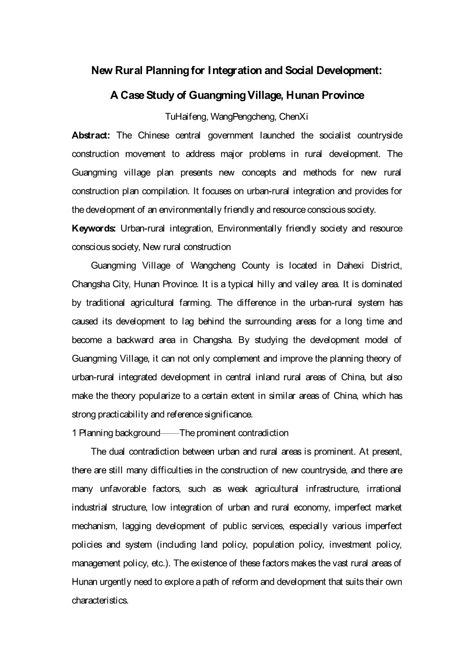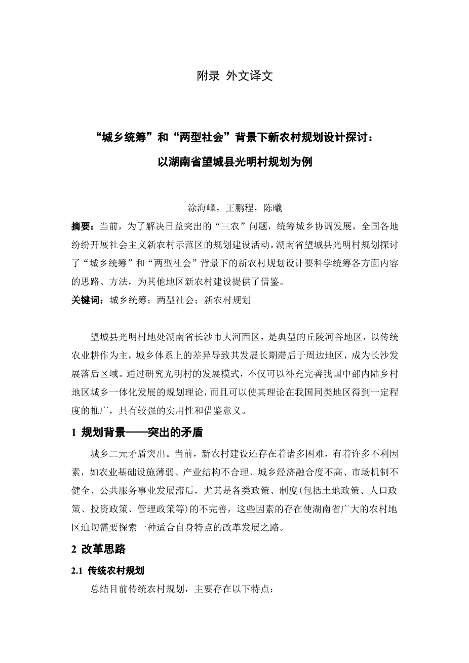 “城乡统筹”和“两型社会”背景下新农村规划设计探讨:以湖南省望城县光明村规划为例外文翻译资料