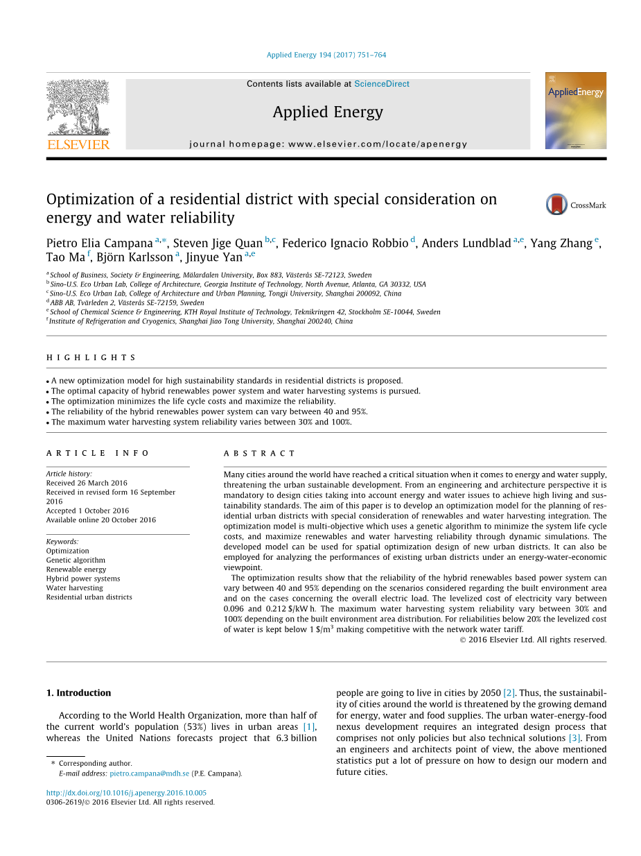世界上许多城市在能源和水资源供应方面都面临着严峻的形势,威胁着城市的可持续发展。从工程和建筑的角度来看,设计城市必须考虑到能源和水的问题,以达到高生活和可持续发展的标准。本文的目的是建立一个考虑可再生能源和集水一体化的城市居住区规划优化模型。该优化模型是一个多目标优化模型,采用遗传算法使系统的生命周期成本最小化,并通过动态仿真使可再生能源和集水可靠性最大化。该模型可用于城市新区的空间优化设计。该方法也可用于从能源-水经济的角度分析现有城市小区的性能。