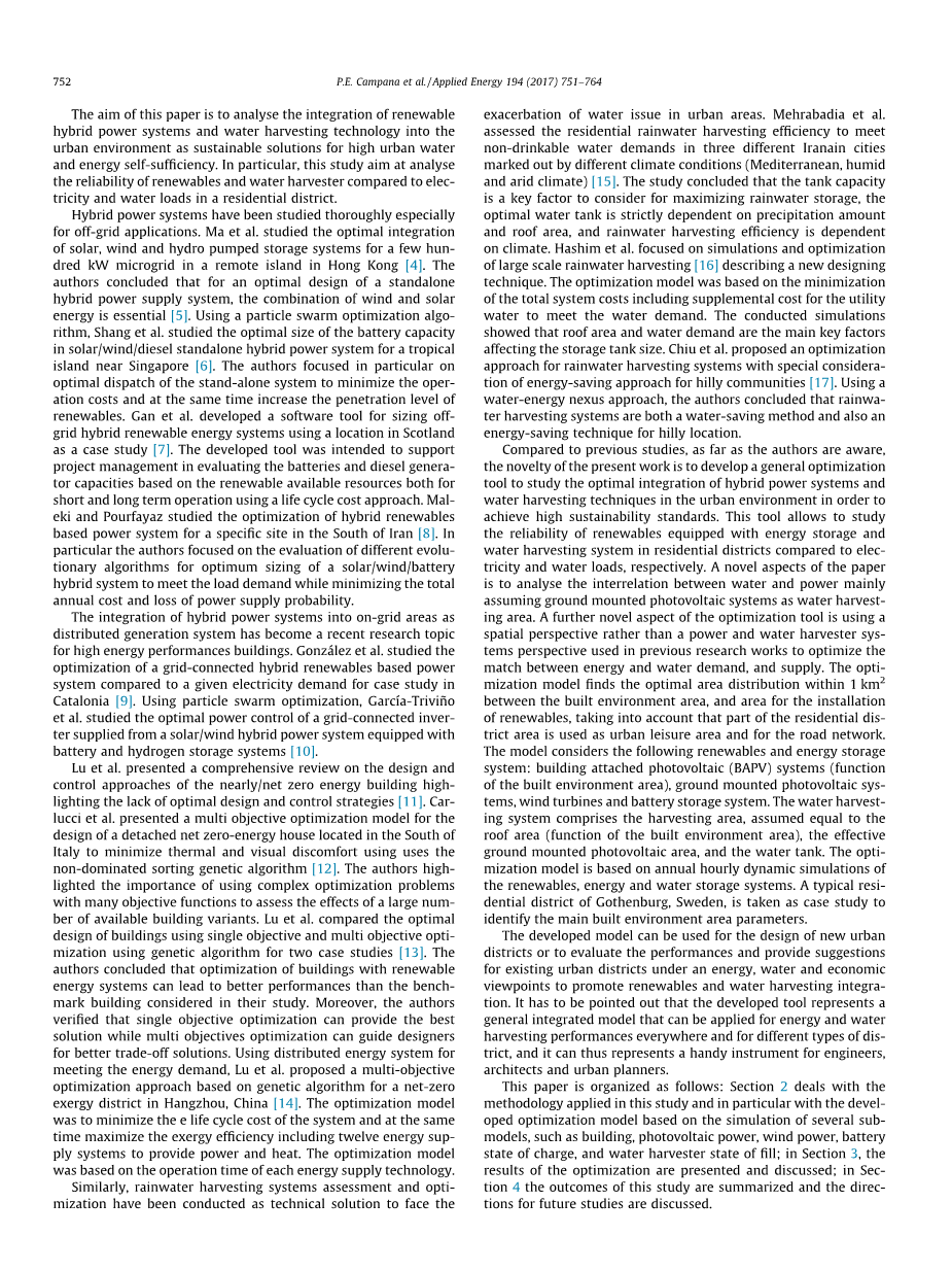 与以往的研究相比,据作者所知,本研究的新颖之处在于开发了一种通用的优化工具来研究混合动力系统和集水技术在城市环境中的优化集成,以达到高可持续性标准。该工具允许研究可再生能源的可靠性,配备了蓄能和集水系统的住宅小区相比,电力和水的负荷,分别。本文的一个新的方面是分析水和电力之间的相互关系,主要假设地面安装光伏系统作为集水区。优化工具的另一个新方面是使用空间视角,而不是以前研究工作中使用的动力和水采集器系统视角,来优化能源和水的需求和供应之间的匹配。该优化模型在考虑部分居住区作为城市休闲用地和路网的情况下,找到了建筑环境区域与可再生能源安装区域之间1平方公里内的最优区域分布。该模型考虑了以下可再生能源和储能系统:建筑附属光伏(BAPV)系统(建筑环境区域的功能)、地面光伏系统、风力涡轮机和电池储能系统。集水系统包括集水面积,假设等于屋顶面积(建筑环境面积的功能)、有效地安装在地面上的光伏区和水箱。该优化模型是基于可再生能源、能源和水储存系统的年度小时动态模拟。以瑞典哥德堡某典型住宅小区为例,确定主要建筑环境面积参数。
