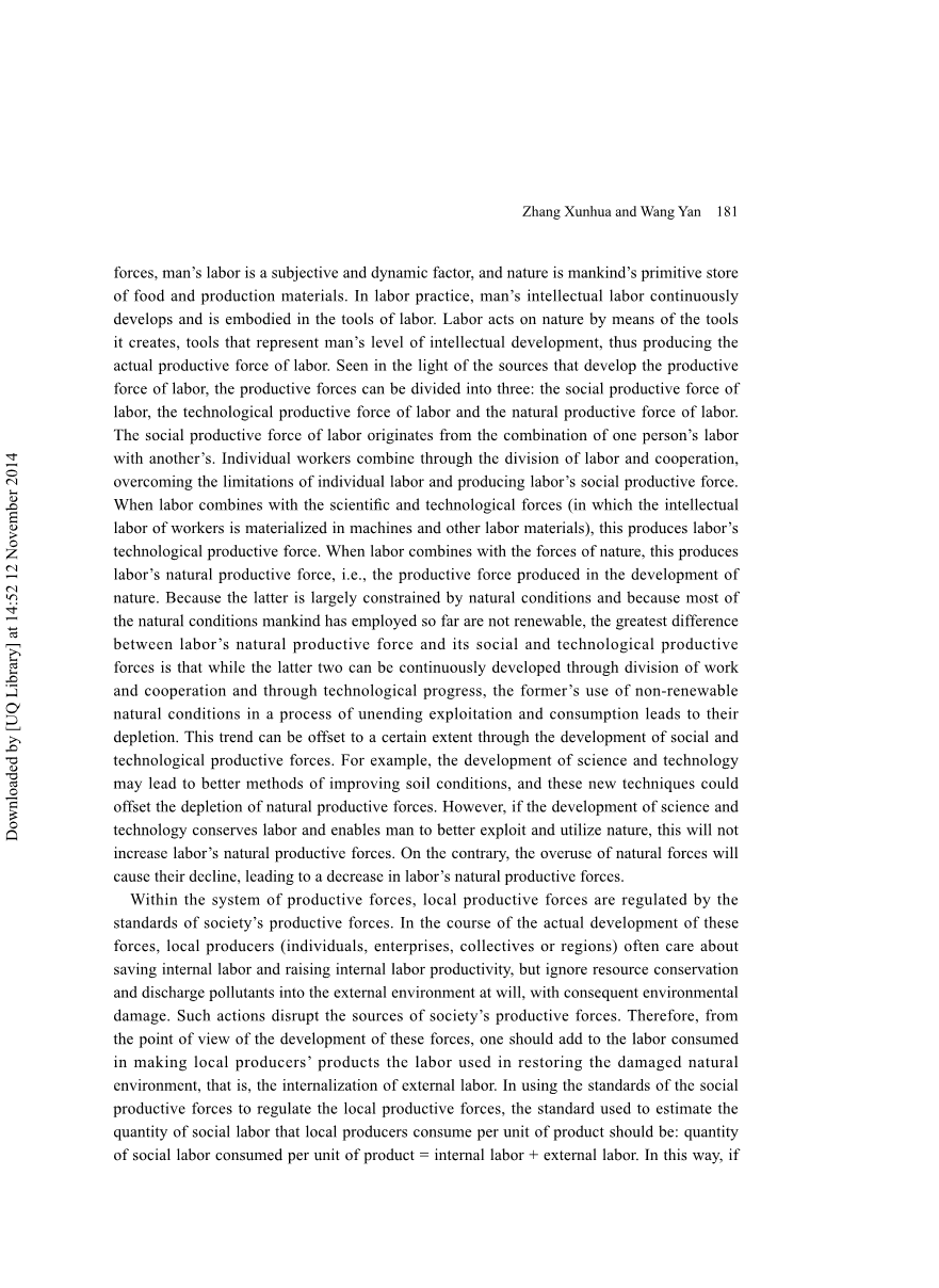 在社会生产力体系中,地方生产力受社会生产力标准的制约。在这些力量的实际发展过程中,地方生产者(个人、企业、集体、地区)往往关心节约内部劳动,提高内部劳动生产率。但忽视资源保护,随意向外部环境排放污染物,造成环境破坏。这种行为破坏了社会生产力的来源。因此,从这些力量的发展来看,应该把生产地方产品所消耗的劳动力作为恢复受损自然环境所用的劳动力,即外部劳动力的内化。在利用社会生产力标准规范地方生产力时,使用的标准估算当地生产商每单位产品消耗的社会劳动力数量应为:每单位产品消耗的社会劳动力数量=内部劳动力 外部劳动力。这样,如果那些只关心节约内部劳动力、提高内部生产力、排放污染物、破坏环境的人,作为社会生产力的地方生产力,将被耗尽而不是提高。