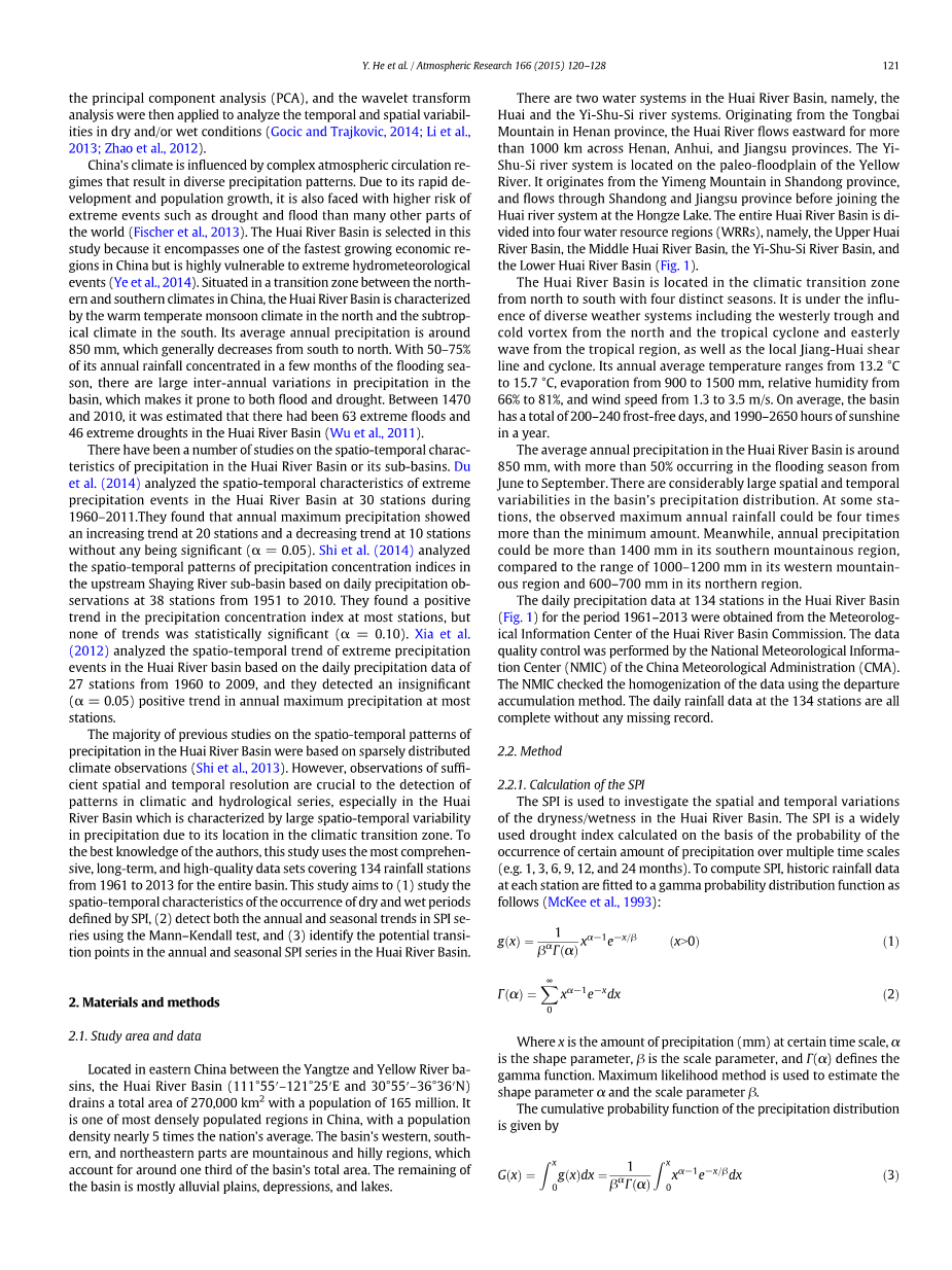 以前的研究中大多数是基于分布稀疏的气候观测资料来分析淮河流域降水的时空格局(Shi et al., 2013)。然而,充分的时间和空间分辨率的观测对于气候和水文系列格局的探查是至关重要的,尤其是在淮河流域,由于处于气候过渡地带,它的特点是降水具有大的时空变异。为了读者们更好的了解,本研究使用了最全面、长期和高质量的数据集,此数据集包含了整个流域134个降雨站从1961年到2013年的数据。本研究旨在(1)利用SPI标定干时期,研究其发生的时空特征,(2)使用M-K检验法来监测年度和季节性SPI系列的趋势,和(3)确定淮河流域年度和季节性SPI系列的潜在转换点。