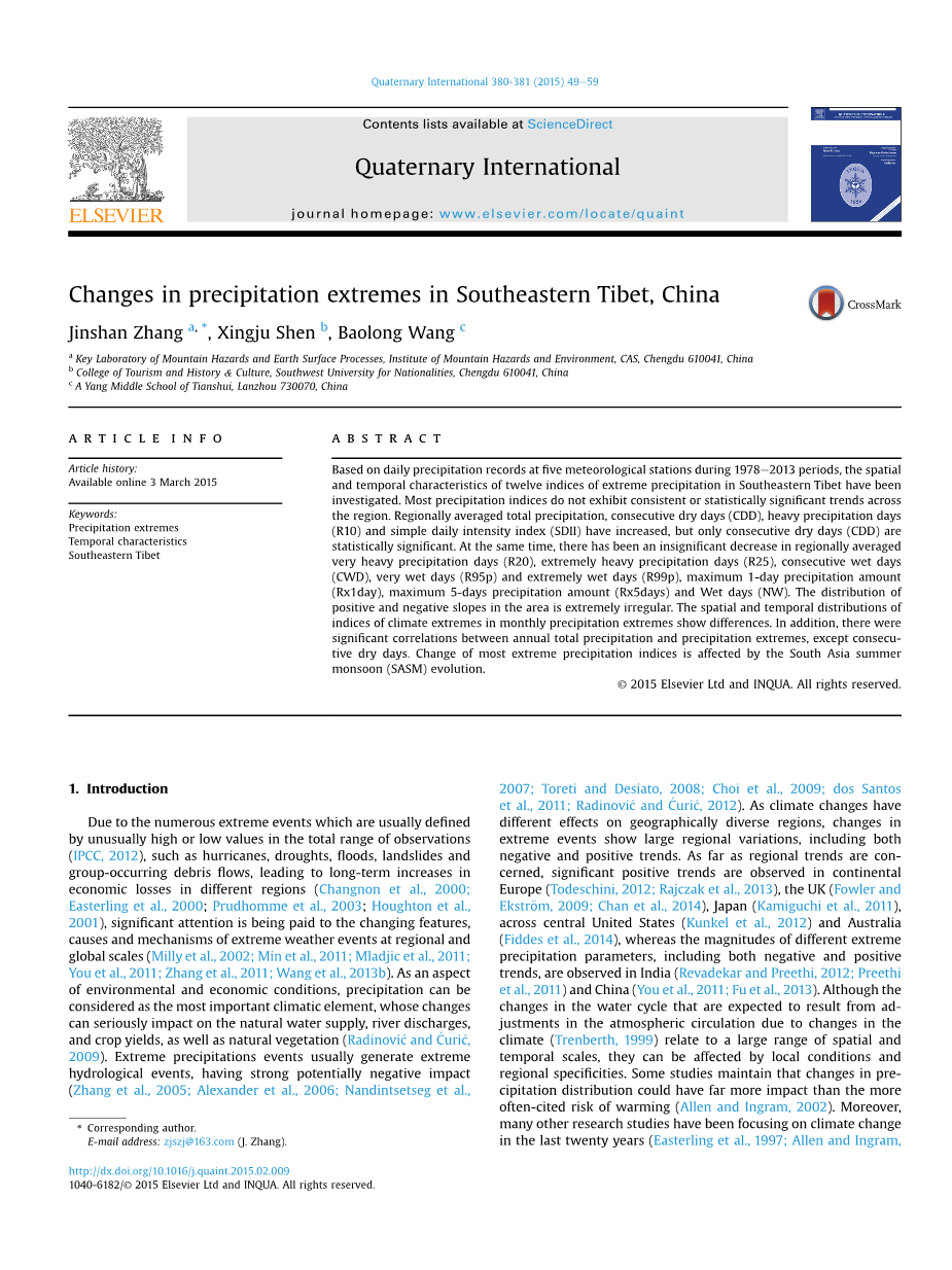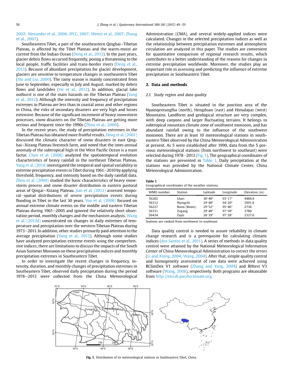 由于各种极端的事件,通常是由观测总范围内的异常高值或低值 (IPCC, 2012)所定义,如飓风、干旱、洪水、滑坡和群发生的泥石流,导致不同地区的经济损失长期增加(Chang non等,2000; 伊斯特林等,2000;普吕多姆等,2003; Houghton等,2001),在区域和全球范围内的极端天气事件的变化特征、原因和机制的变化引起了巨大的关注(Milly等,2002; Min等人,2011; Mladjic等,2011;你等,2011; Zhang等,2011;王等人,2013b。)作为环境和经济条件的一个方面,降水可被认为是最重要的气候要素,其变化会严重影响自然水供应、河流排放、作物产量以及自然植被(Radinovic和Curic, 2009)。极端降水事件通常产生极端的水文事件,具有强烈的潜在负面影响(Zhang 等, 2005;亚历山大等.,2006; Nandintsetseg 等.,2007;Toreti Desiato,2008;崔等.,2009;多斯桑托斯等人,2011年;Radinovic Curic,2012)。由于气候变化对地域不同的地区有不同的影响,极端事件的变化表现出较大的区域差异,包括消极和积极的趋势。就区域趋势而言,欧洲大陆观察到显著的积极趋势(Todeschini, 2012;Rajczak 等., 2013),英国(Fowler和埃克斯特罗姆,2009; Chan等,2014),日本(上口等人,2011),横跨美国中部(Kunkel等,2012)和澳大利亚(Fiddes等,2014),而不同的极端降水参数,包括积极和消极的趋势,在印度(Revadekar和Preethi,2012; Preethi等,2011)和中国(你等,2011;傅等,2013)。尽管由于气候变化而引起的大气环流调整(Trenberth, 1999)所预期的水循环变化与大量的空间和空间有关。在时间尺度上,它们可以受到当地条件和区域特征的影响。一些研究认为降水分布的变化可能比更常引起的变暖风险更具影响力(Allen和Ingram,2002)。 此外,近二十年来许多其他研究一直关注气候变化(Easterling等,1997; Allen和Ingram2002; Alexander等,2006; IPCC,2007; Wentz等,2007; Zhanget等,2007)。青藏高原的东南部受青藏高原和印度洋暖湿气流影响(Deng 等。,2013)。在过去的几年中,冰川泥石流频繁发生,对当地居民,交通设施和跨界河流构成威胁(Deng等,2013)。由于冰川发育降水充沛,冰川对西藏东南部的温度变化敏感(Shi and Liu,2000)。雨季主要集中在6月至9月,尤其是7月和8月,以泥石流和山体滑坡为主(He et al。,2012)。另外,冰川湖的突出是青藏高原的主要危害之一(Yang et al。,2012)。虽然高原降水极值的强度和频率低于中国沿海地区和其他地区,但次生灾害的风险很高,损失也很大。由于大暴雪过程的显着增加,自20世纪90年代以来青藏高原的雪灾越来越严重和频繁(Zhou等,2000)。近年来,青藏高原降水极值研究取得了较为丰硕的成果。董等人。 (2001)讨论了青藏高原畜牧场的雪灾气候特征,并指出西太平洋副热带高压的年际异常是一个主要因素。陈等人。 (2006)分析了青藏高原东北部暴雨的时空演变特征。杨等人。 (2014)通过应用基于日降水量数据的阈值,频率和强度,调查了1961-2010年西藏极端降水事件的时空变化。周等人(2000)研究了青藏高原东部牧区暴雪过程和雪灾分布的基本特征。 Jian等人(2012)评估了近30年来西藏洪水过程中严重降水事件的时空分布。你等人。 (2008)关注青藏高原中东部地区1961-2005年年极端气候事件,并忽略了相对较短的观测期,月变化和机理分析Wang等人 (2013d)集中于1973年至2011年青藏高原西部气温和降水的日变化。 另外,其他研究主要关注平均降水量(Yang et al。,2013)。 尽管一些研究利用综合指数分析了降水极端事件,但讨论南亚夏季风对西南东南部降水指数和月降水量极端事件的影响存在局限性。为了研究西藏东南部地区降水极值频率,强度,持续时间和月变化的最新变化,我们从中国气象局收集了1978年至2013年期间观测到的每日降水量以及几个广泛应用的指数进行了计算。 分析了选定降水指数的变化以及降水极值与大气环流的关系。 这些研究方便了定量比较区域研究结果,这有助于更好地了解全球极端降水变化的原因。 此外,这些研究在评估和预测西藏东南部极端降水的影响方面发挥着重要作用。