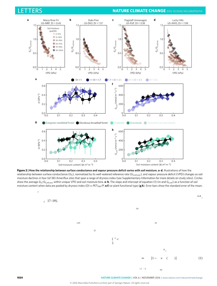 我们观察到在相近的DI值中,VPD在愈发湿润的站点上的限制作用具有很大差异。例如,在矮小植被生态系统中土壤水分的限制作用比在森林中更显著(图3a),这可能表明在高大植被生态系统中植物储水系统或深根系统的重要性6。决定气孔导度对VPD敏感性的因素是植物水分利用机制(例如,异羟基或异羟基)1,27,28。所有这些差异的考虑都不在本研究的范围内,但应该是未来研究的方向。