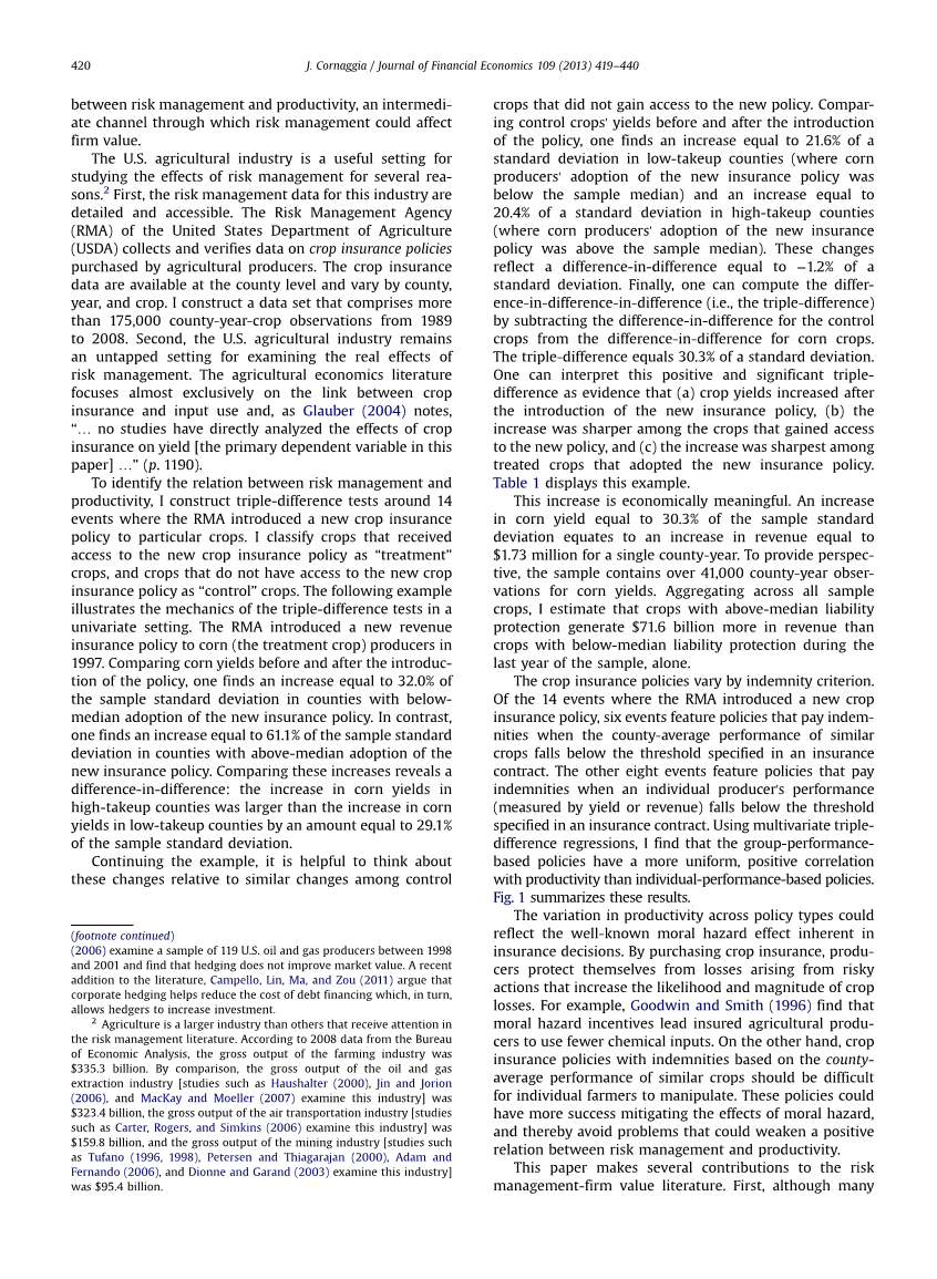 有如下几个理由表明美国农业生产对于风险管理的研究非常具有价值。首先,首先,这个行业的风险管理数据详细且可获取。美国农业部的风险管理机构收集并核实作物保险政策,并由农业生产者购买。作物保险有县级的可供选择,有县、年和作物的三种区别。我构建了一个包含1989年到2008年全国超过17.5万个县级作物观测资料数据集。其次,美国农业依然存在一个未开发的设置,用于检查风险管理的实际效果。农业经济学文献几乎完全专注于作物保险和投入使用之间的联系,并由Glauber (2004)指出,“没有研究直接表明了作物影响保险收益......”(P1190)。为确定风险管理与生产力之间的关系,我对RMA新推出的14种对特定作物的作物保险政策构建三重差分测试。我将收到的作物进行分类定义,获得新的作物保险单定义为“处理”作物,而没有获得新的作物保险单的则定义为“对照”作物。以下示例说明了三重差分测试的单变量设置机制,1997年,RMA推出了新的收入玉米生产者的保险单,比较玉米在实行该政策前后的产量,实行政策后产量增幅相当于采用县级以下新的保险单样本标准差的32.0%。新保险单的增加等于县的偏差高于中位数样本标准的61.1%。比较这些增长显示:高收益县的玉米产量比低收益县的产量在样品标准差偏差上高出约29.1%。