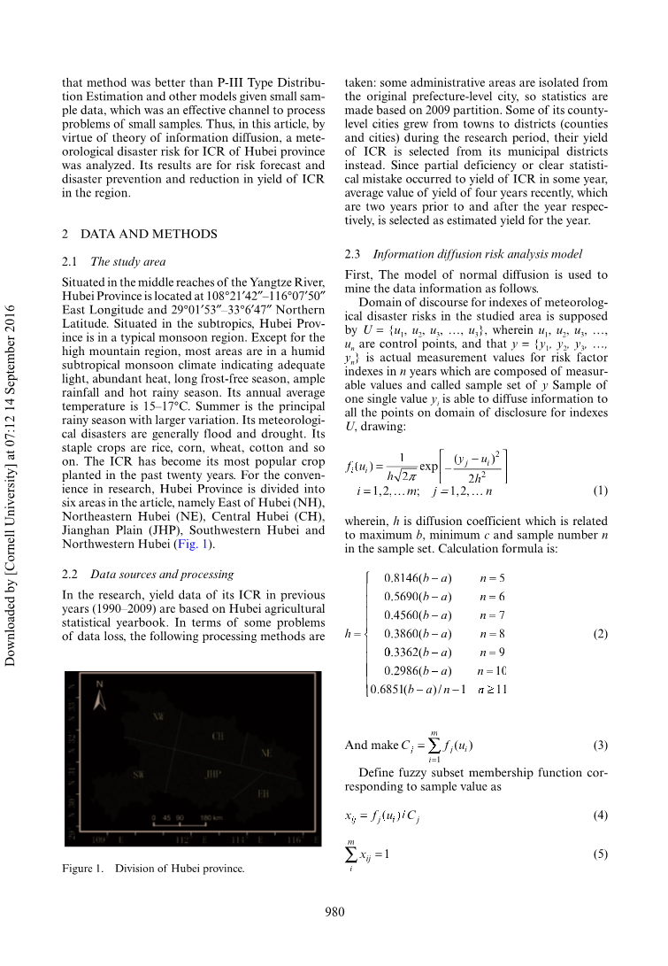 为了解决上述问题,Huang Chongfu教授提出了基于信息传播(Huang 2006)的灾难风险评估方法,坚持转向信息传播和模糊数学理论基础的理论的模糊集的观察值。此外,灾后风险被引入后,信息传播的模型被广泛应用于洪水,干旱,火灾,地震,雷暴和环境污染的风险评估,以及进一步扩展到水资源短缺风险评估,战场等领域军事风险评估(Yao 2009,Goodwin 1998)。比较研究显示(Jiang 2008),该方法优于P-III型分布估计和其他给定小样本数据的模型,这是一个有效的来处理小样品问题的渠道。因此,在本文中,通过信息传播理论的美德,分析了湖北省ICR的气象灾害风险。其结果用于风险预测和在该区域就ICR产量的防灾减灾。