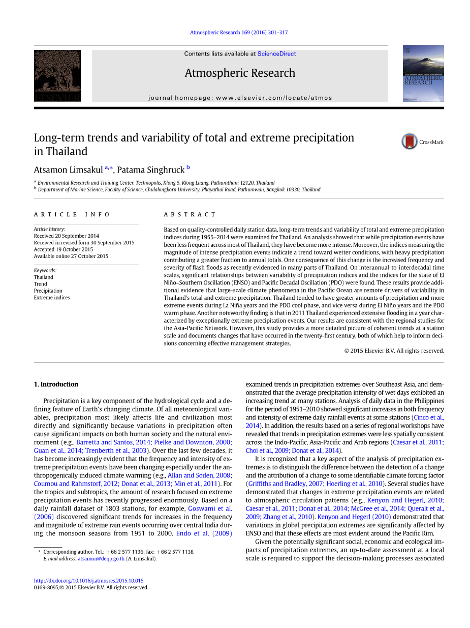 基于质量控制的日报站数据,我们对泰国1955 - 2014年总体和极端降水指数的长期趋势和变率进行了检查。分析显示,虽然在泰国大部分地区,降水事件已经不那么频繁,但降水强度却变得更大。此外,测量强降水强度的指标表明趋向潮湿条件的趋势,这种趋势伴随着对年度总降水量贡献较大的强降水。这种变化的一个后果就是正如最近在泰国许多地方被证实的洪水的频率和严重程度的增加。在年际至年代际时间尺度上,降水指数变率与厄尔尼诺 - 南方涛动(ENSO)和太平洋年代际振荡(PDO)状态指数之间的显着关系被发现。这些结果提供了额外的证据表明太平洋的大规模气候现象是泰国全面和极端降水变化的远程驱动因素。 泰国在拉尼娜年和PDO冷阶段往往有更多的降水量和更极端的事件,在厄尔尼诺现年和PDO暖阶段,反过来也一样。另一个值得注意的发现是,在有特大极端降水事件的2011年,泰国遭遇了大洪水。 我们的结果与亚太地区的区域研究一致。 然而,这项研究提供了一个更加详细的一站式趋势图,并记录了二十一世纪发生的变化,这两者都有助于通过有关有效的管理策略的决定。