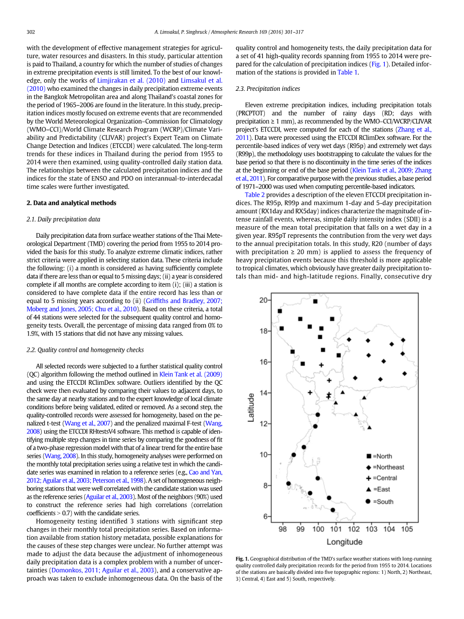 泰山气象台(TMD)地表气象台覆盖的1955年至2014年的每日降水数据为本研究奠定了基础。为了分析极端气候指标,选择站点数据时采用相当严格的标准。这些标准包括以下内容:(i)如果少于或等于5个失踪天数,一个月被认为具有足够完整的数据; (ii)如果所有月份根据(i)项完成,则一年被认为是完整的; (iii)根据(ii)(Griffiths和Bradley,2007; Moberg和Jones,2005; Chu等,2010),如果整个记录的全部记录少于或等于5个失踪年份,则一个站被认为具有完整的数据。 根据这些标准,共选择44个站进行随后的质量控制和均匀性测试。 总体而言,失踪数据的百分比范围为0%至1.9%,其中15个站点没有任何缺失值。