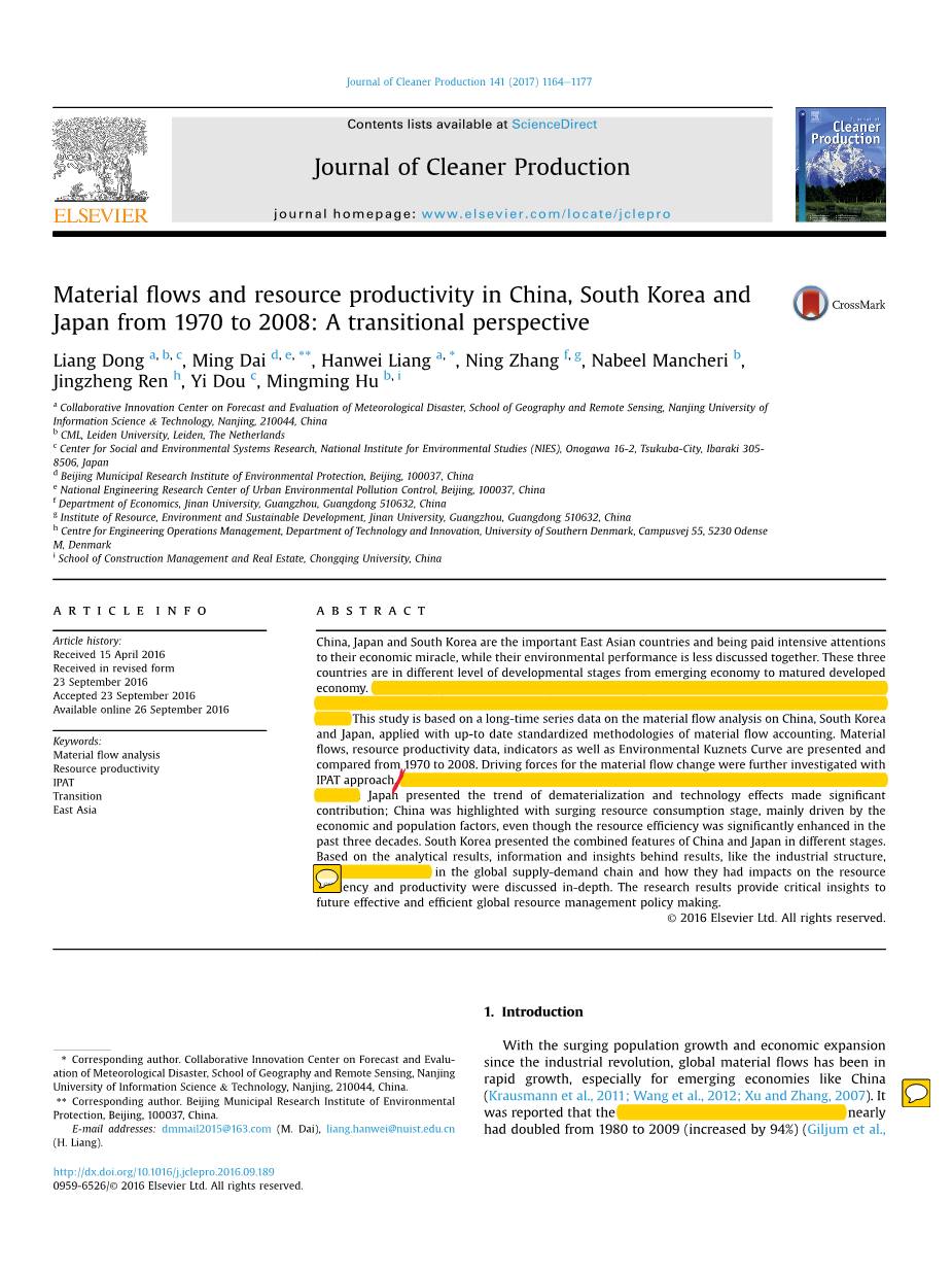 为了处理这些问题,本文在长时间尺度下分析比较了中国、韩国和日本的物质流和资源产出率。进一步的,本文应用了IPAT框架调查了物质流随时间改变的主要驱动因素。另外,本文还通过分析总结发达经济体的周期规律,为像中国一样的新兴经济体提出了重要的政策建议。