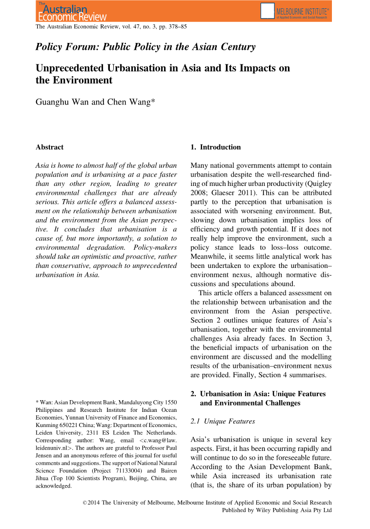 摘要 亚洲约占了全球城市人口的一半,城市化的速度相比其他地区更快,导致了严重的环境挑战。基于亚洲人视角,本文对城市化与环境之间的关系进行了均衡的评估。结论是,城市化是环境退化问题的一个原因,但更重要的是解决环境退化问题。政策制定者应采取乐观积极主动而非保守主义的方式来应对亚洲前所未有的城市化。